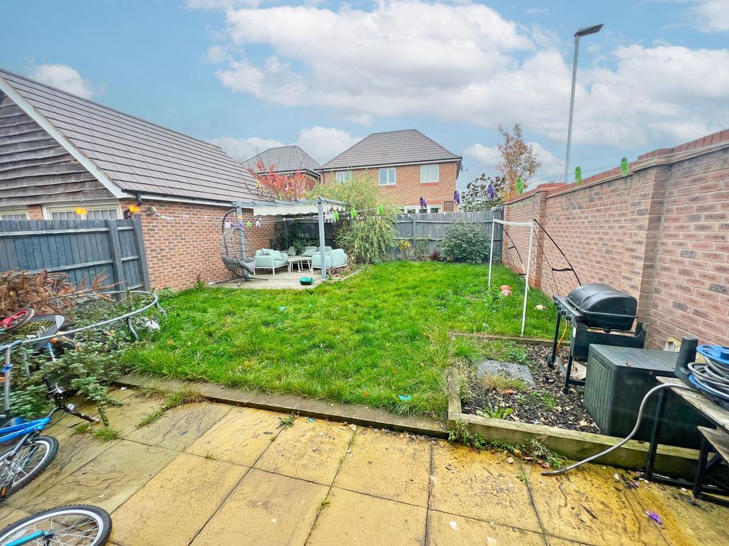 Outside the rear is a slabbed patio, lawn, and a pergola, with brick and wood panel fencing surrounding it. The property also benefits from having access to a single garage and a driveway.