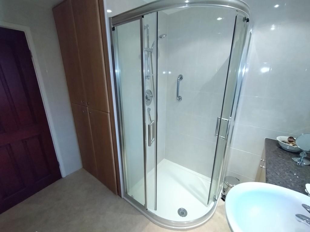 BATHROOM Widow to the rear elevation. Suite comprising: corner shower cubicle, low level W.C, wash hand basin. Tiled walls. Cupboard housing the Bosch condensing central heating boiler.