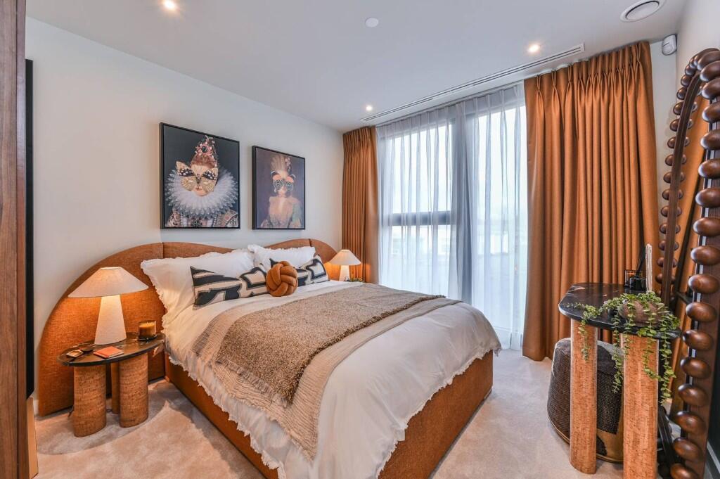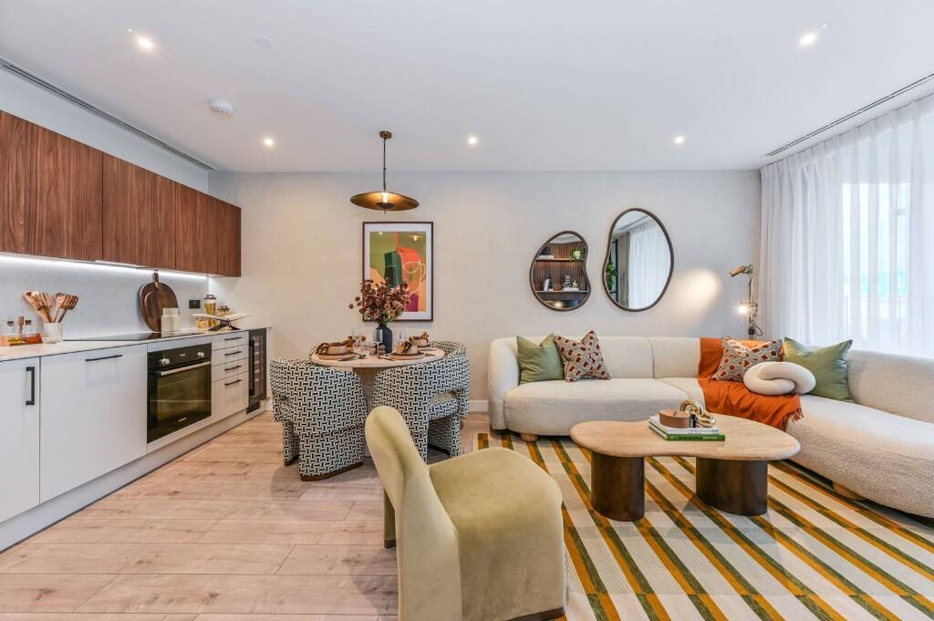The open-plan living and dining area includes a Bosch-integrated kitchen, while the spacious bedroom is paired with a contemporary bathroom finished to a high standard. A private terrace offers a peaceful outdoor retreat, overlooking landscaped podium gardens with seating areas, play zones, and natural planting.