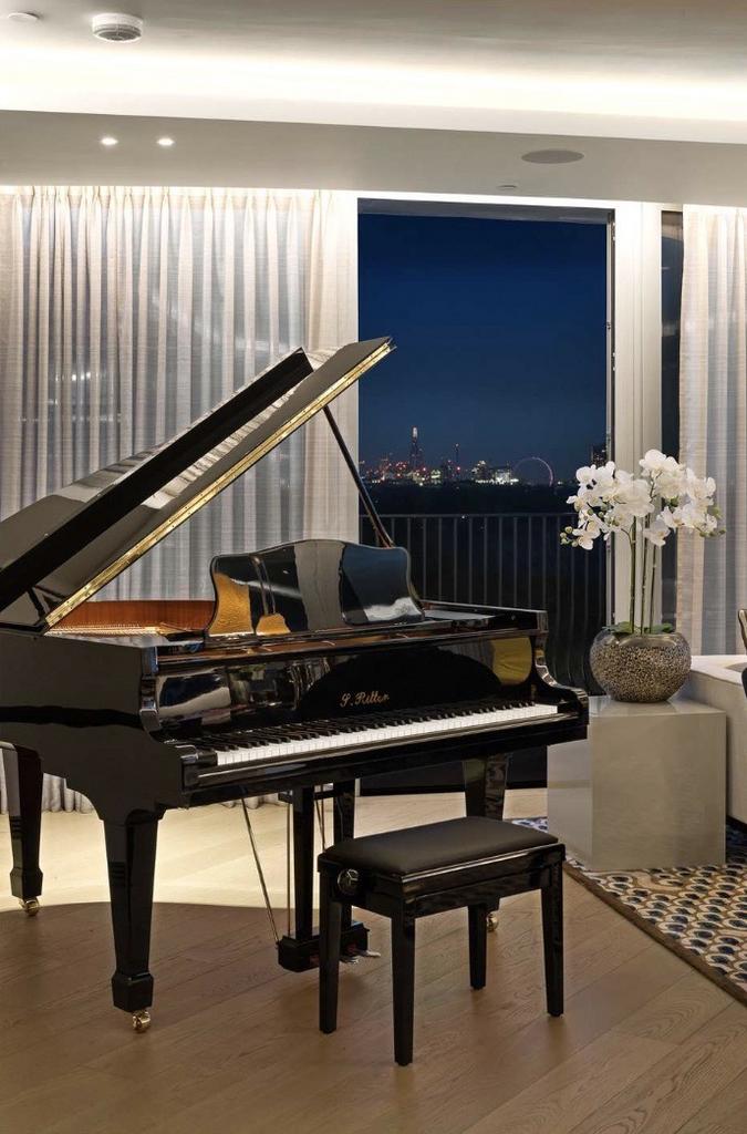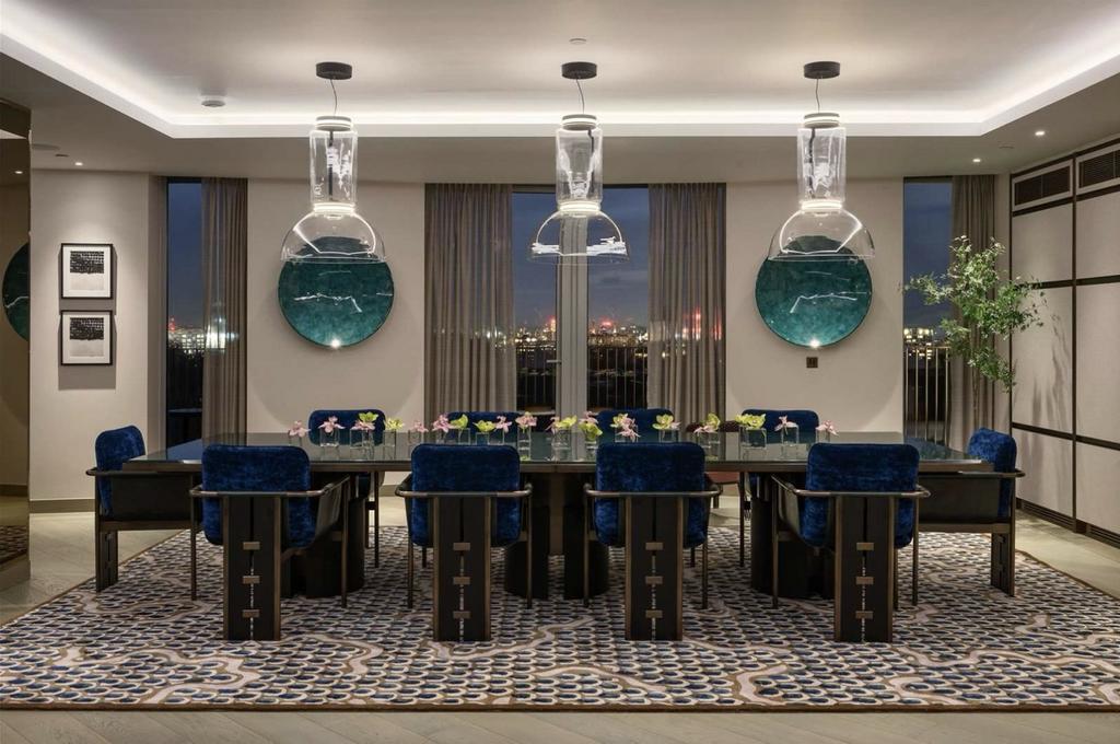 Designed with both relaxation and entertaining in mind, the spacious, light-filled living area features floor-to-ceiling glass that frames the iconic London skyline and floods the home with natural light throughout the day. The open plan kitchen is fitted to exacting standards, including state-of-the-art Gaggenau appliances, elegant worktops and ample storage, making it the heart of the home for culinary excellence and convivial gatherings alike.