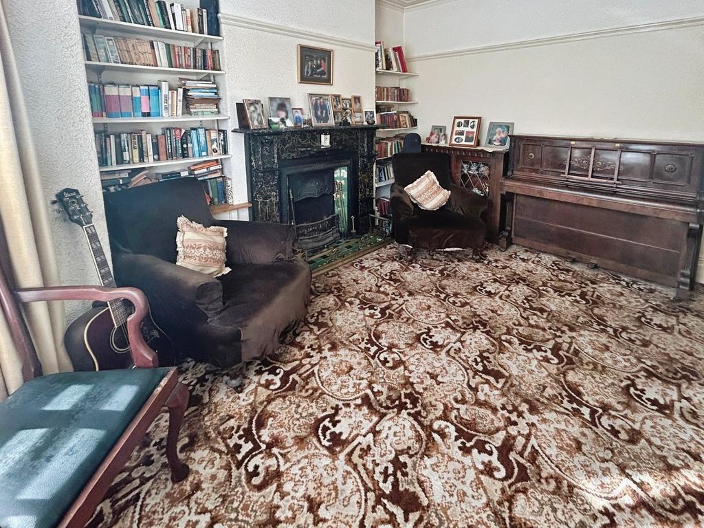 3.20m x 3.49m (10' 6" x 11' 5") Original coved and papered ceiling with central ceiling rose, picture rail, papered walls, fitted carpet, radiator and PVCu double glazed window to the rear with curtains. Original tiled open fireplace with ceramic tiled surround. Alcoves with shelving.