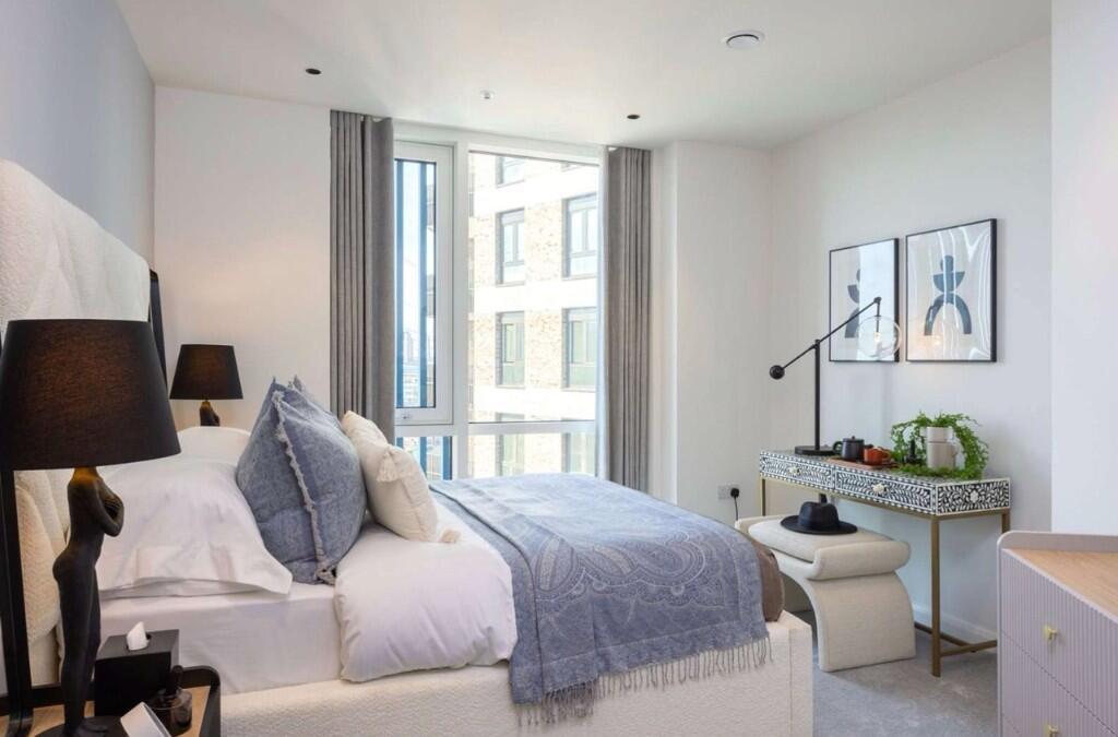 A beautifully planned two-bedroom, two-bathroom apartment offering 865 sq ft (80.36 sq m) of refined living at the heart of a major waterside regeneration in Canada Water. With generous ceiling heights and Crittall-style floor-to-ceiling glazing, the open-plan kitchen, dining and living area is flooded with natural light and opens onto a private balcony capturing wide city and dockside views.