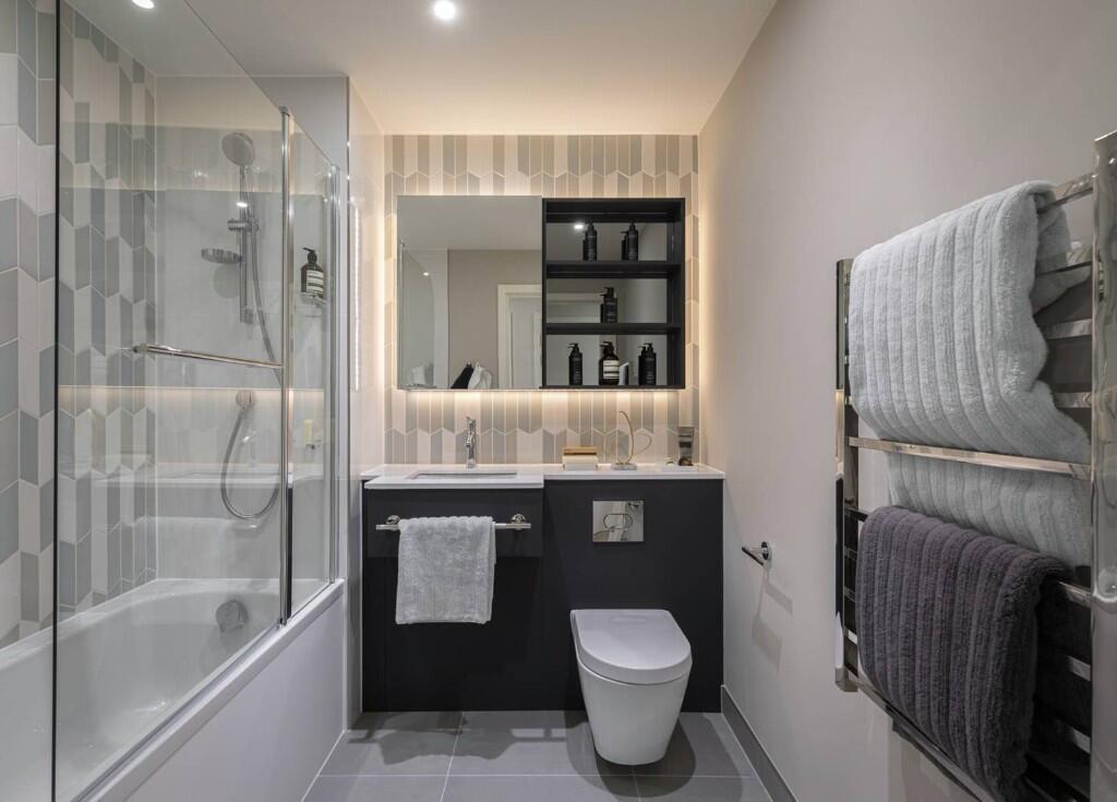Interiors are crafted with a modern, elegant palette, featuring underfloor heating, bespoke fitted wardrobes, and premium finishes throughout. The open-plan living area includes a fully integrated Siemens kitchen, designed for both comfort and style — perfect for relaxing or entertaining. Bathrooms feature bespoke vanity storage, heated towel rails, and sleek modern tiling for a refined aesthetic.
