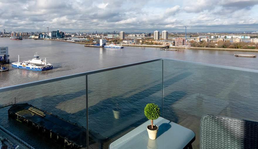 Located in the heart of Woolwich SE18, this beautifully appointed two-bedroom, two-bathroom apartment combines elegant design, modern comfort, and exceptional convenience. Set on the 9th floor and spanning 834 sq ft, the home offers bright, open-plan living spaces finished to a high specification, with full-height glazing that fills the interiors with natural light. A private balcony with south and south-west views creates the perfect spot to unwind and take in the surrounding skyline.