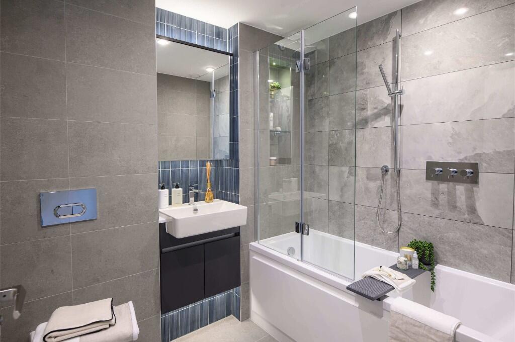 Designed for contemporary London living, the apartment features a stylish integrated kitchen, a spacious principal bedroom with fitted wardrobes and en-suite, and a second double bedroom ideal for guests or home working. Premium finishes, soft tones, and sleek materials create a calm, timeless atmosphere throughout.