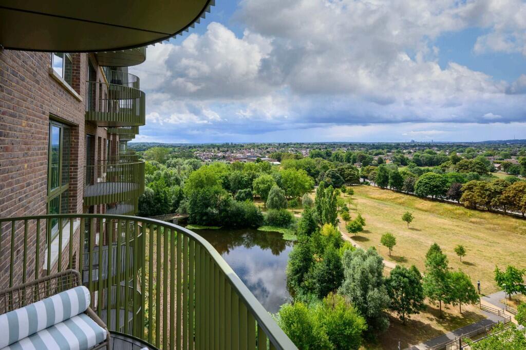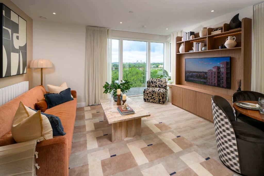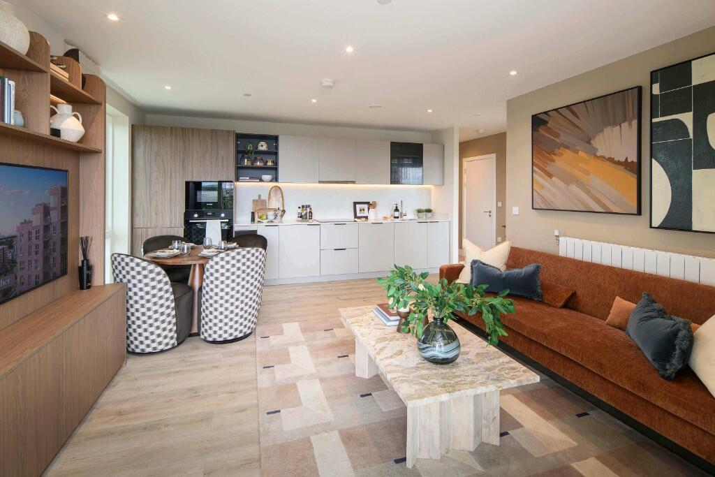 This elegant three-bedroom, two-bathroom apartment perfectly blends contemporary design with tranquil green surroundings in one of South East London’s most desirable new neighbourhoods. Generous floor-to-ceiling windows fill the open-plan living and dining area with natural light, creating a bright and inviting space ideal for modern family life. A private balcony offers views across landscaped gardens and the London skyline, providing the perfect spot to relax or entertain.
