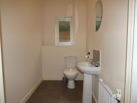 Into hallway with wooden flooring there is a downstairs cloakroom and additional storage.