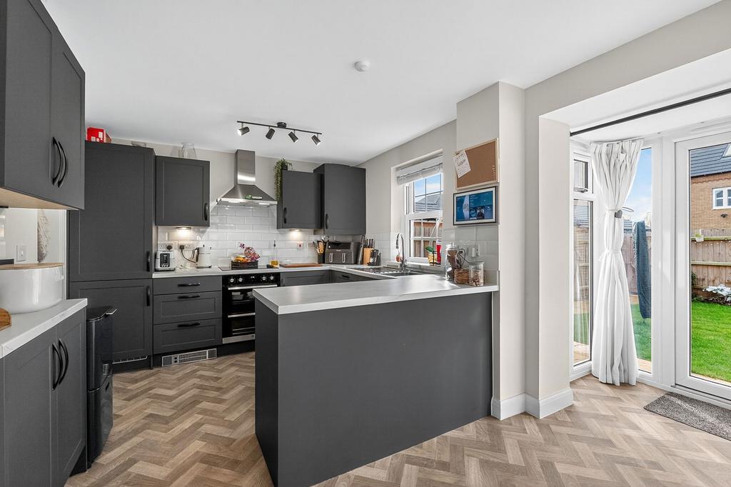 A welcoming entrance hall sets the tone, offering access to both principal living areas. To the left, the spacious dual-aspect lounge provides a bright and relaxing environment, enhanced by a charming bay window and plenty of natural light throughout the day. To the right, the beautifully presented kitchen/diner features sleek, modern units, integrated appliances and another attractive bay window. Pod-style French doors open directly onto the rear garden, creating a seamless flow between indoor and outdoor living. A separate utility room provides invaluable additional space, while the ground floor is completed by a convenient cloakroom WC.