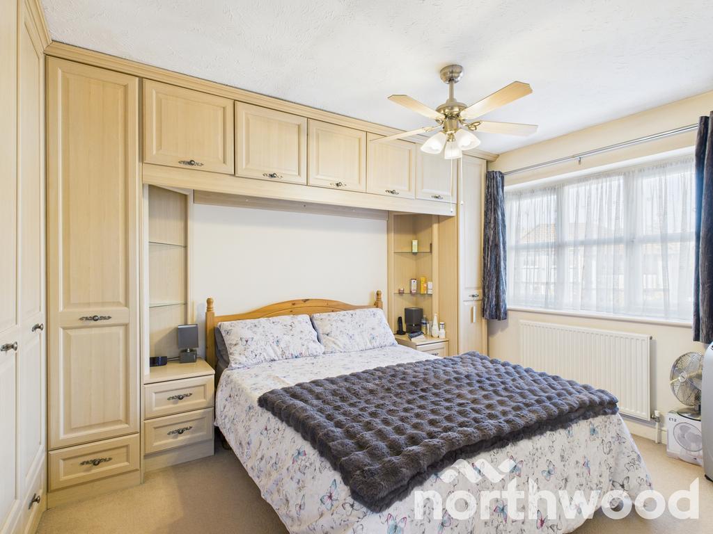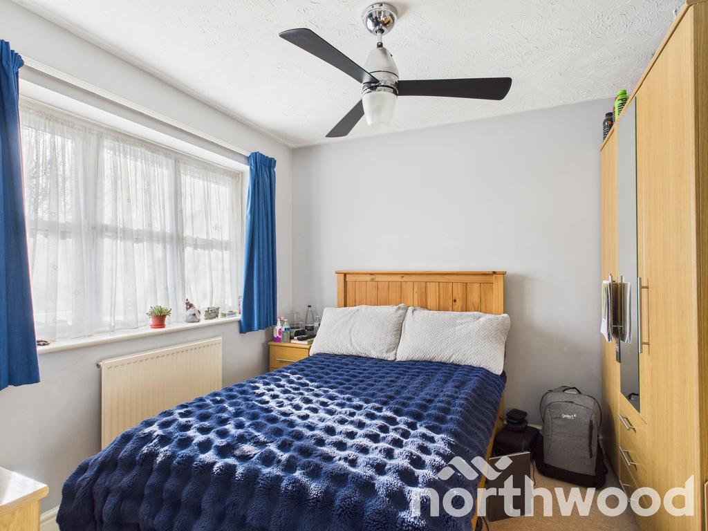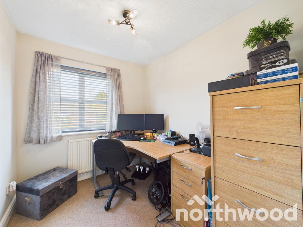 Upstairs, the property offers two generous double bedrooms and a third single bedroom currently used as a home office. Each room is well-presented, with neutral décor and ample natural light. The family bathroom is smartly finished with warm beige tiling and a clean white suite comprising a curved-edge bathtub, wall-mounted sink, and low-level WC. A unique feature window adds a touch of character while allowing natural light to brighten the space. Thoughtfully arranged shelving and fittings make this a practical and stylish room