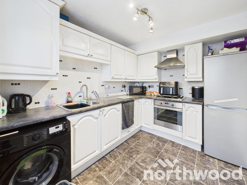 Step into a welcoming entrance lobby with access to a convenient downstairs cloakroom featuring WC and basin. The front-facing living room is bright and inviting, with a large window overlooking the front garden and a staircase leading to the first floor. An archway opens into a dedicated dining area, ideal for family meals and entertaining. The kitchen is sleek and functional with crisp white cabinetry, dark worktops, and a stylish tiled splashback with monochrome accents. It’s fully equipped with integrated appliances including a stainless steel oven, hob, and extractor, plus space for a washing machine and fridge-freezer. The layout flows effortlessly into the conservatory, offering additional living space and direct access to the rear garden