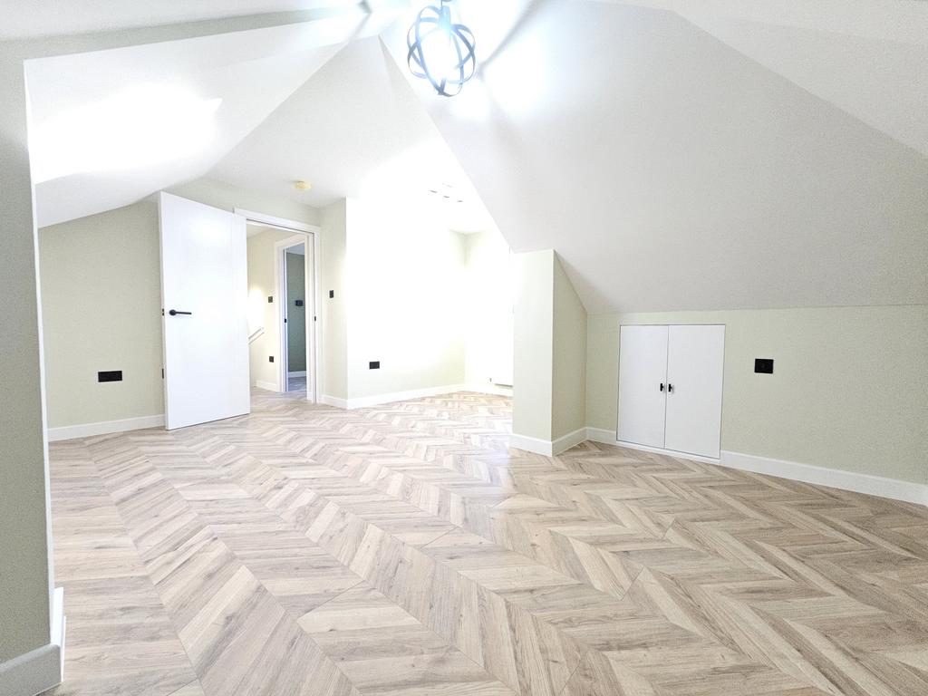 Upon entering, you are welcomed by a stunning open-plan living area adorned with elegant herringbone flooring, which seamlessly connects the generously sized lounge and the sleek modern kitchen. The kitchen is thoughtfully designed with high-gloss cabinetry, integrated appliances, and finished with quality worktops and chic white subway tiling. Enjoy preparing meals or entertaining in this light-filled space, illuminated by large windows and understated recessed lighting.
