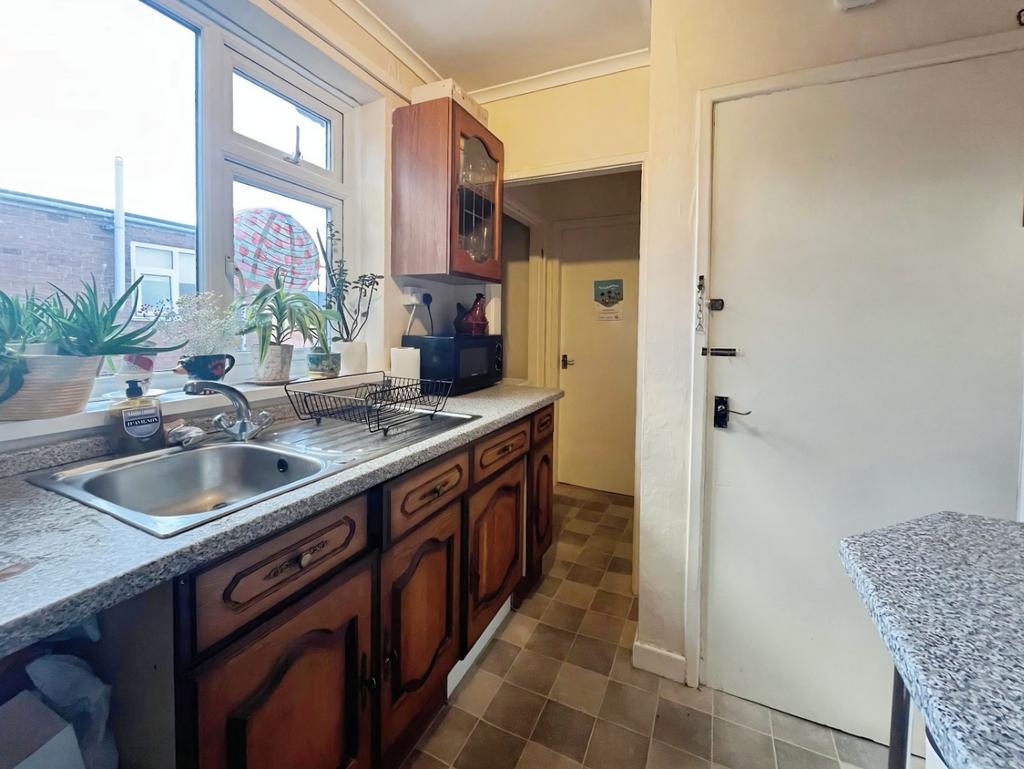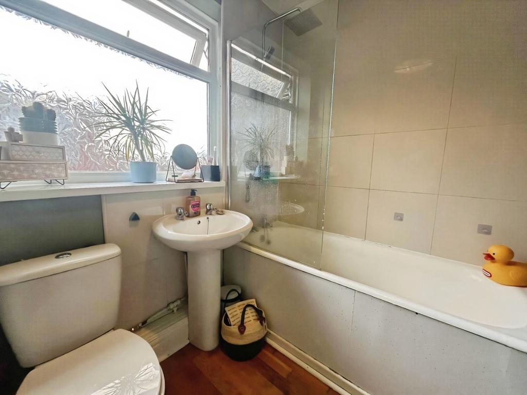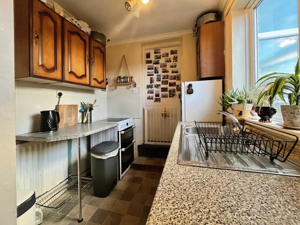 Through the living room, the kitchen offers ample cupboard and counter space, with room for a fridge freezer and other appliances—ideal for everyday use. To the rear of the property is a well-proportioned bathroom, fitted with a bath and overhead shower, toilet, and wash basin.