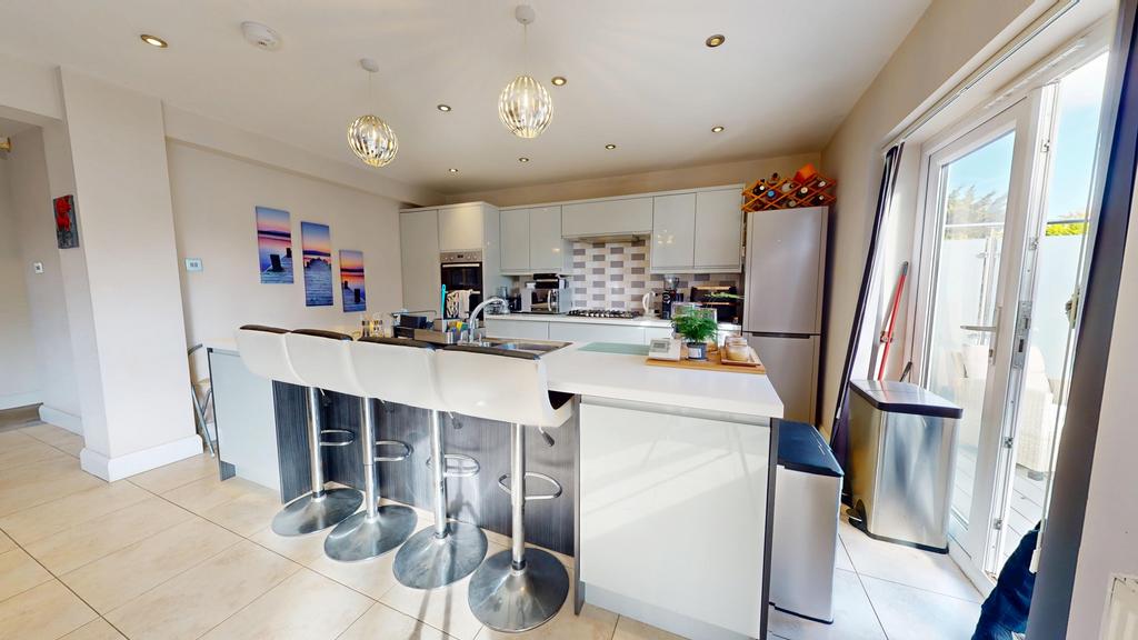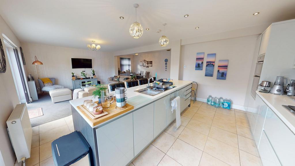 The open plan living room and kitchen is the real ‘WOW’ factor, and makes an incredible space to enjoy. With ample room for table and chairs, sofas, and still room to spare, this is the ideal family living space. The kitchen is a modern and stylish design, with breakfast bar island, along with stylish worktop and plenty of storage space as well.