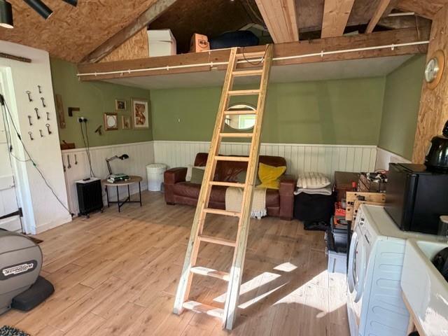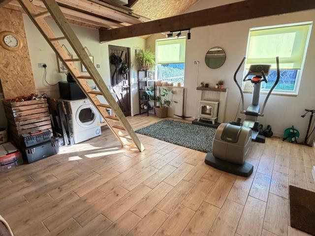 Former Garage/Verstaile Outbuilding - 5.41m x 4.29 (17'8" x 14'0") - The former garage has been thoughtfully converted into a highly versatile additional room, ideal for a studio, home office, gym, or a range of other recreational uses. It benefits from two exterior doors and windows that provide natural light and flexible access. Inside, there is a Belfast sink with a water tap, offering practical utility for creative or hobby activities. A set of stairs leads to a useful loft area, perfect for extra storage. This excellent multi-purpose space enhances the overall functionality of the property.