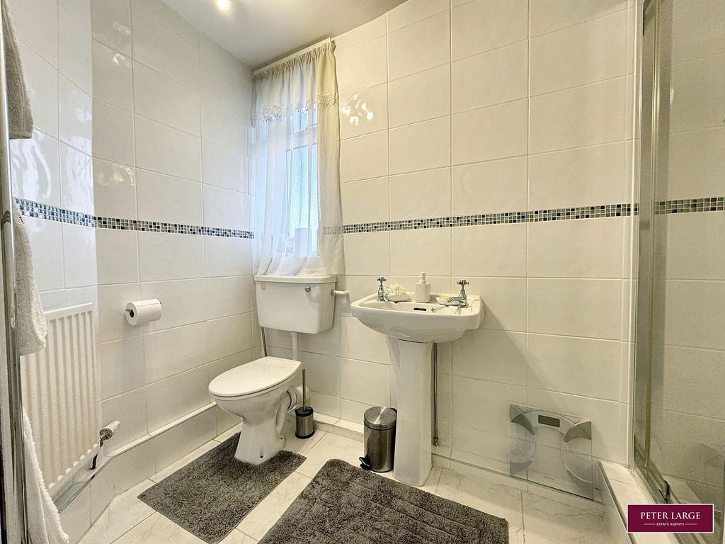 Having a three piece suite comprising purpose built shower cubicle housing a 'Mira' electric shower, pedestal wash hand basin, low flush w.c., radiator, chrome heated towel rail, fully tiled walls, complimentary floor tile and a obscure glazed window.