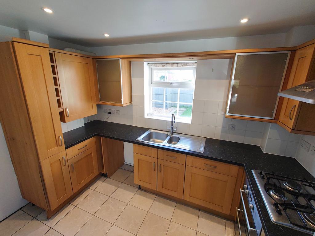 Modern fitted kitchen with granite effect worktops, tiled flooring and splashbacks. Window with view onto South facing garden. A good selection of cupboards with space for freestanding white goods. Integrated Hotpoint dishwasher, four burner gas hob, oven and extractor. Stainless sink and mixer tap.