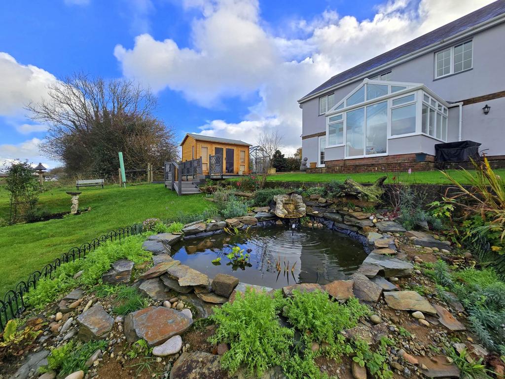 An ornamental pond with a gentle water feature brings a sense of tranquillity, enhanced by established hedge boundaries and mature shrubs that frame the space with privacy and year-round colour. A discreet storage shed provides everyday practicality without compromising the garden's elegance.