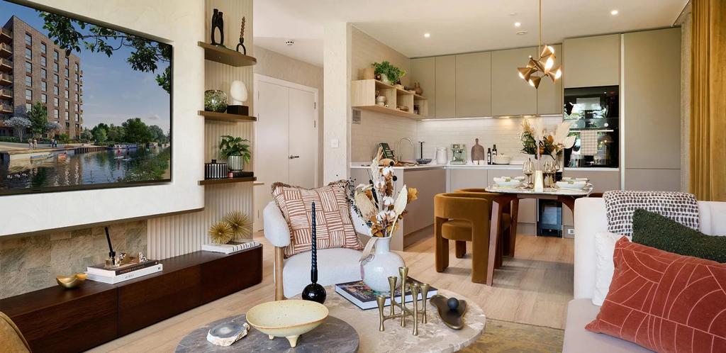 Positioned on the fifth floor, the home enjoys a bright dual-aspect layout with far-reaching views across both the Grand Union Canal and the River Brent. The spacious open-plan kitchen, dining and living area opens onto two private balconies, perfect for relaxing or entertaining. Interiors are finished to an exceptional standard, featuring floor-to-ceiling glazing, engineered flooring, and a sleek fitted kitchen with integrated appliances. The principal bedroom includes a built-in wardrobe and an en-suite, while the additional bedrooms offer flexibility for family life or a home office.