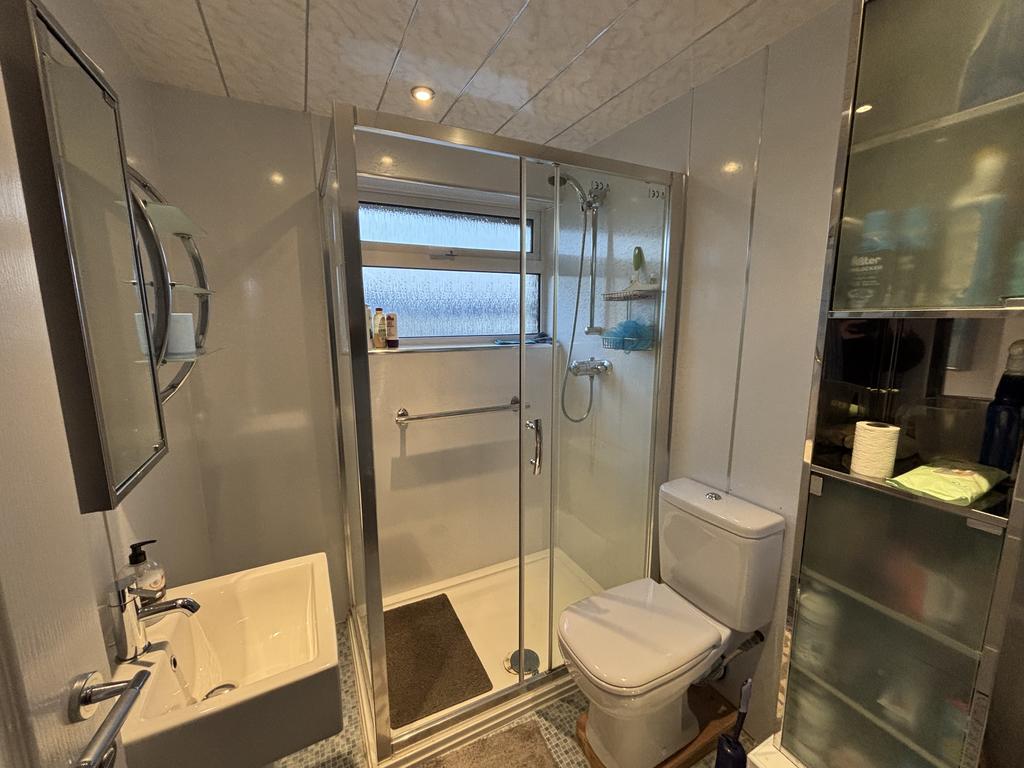 Bathroom 3 piece suite comprising shower cubicle, pedestal hand basin and low level WC. Heated towel rail, double glazed window and spot lighting.