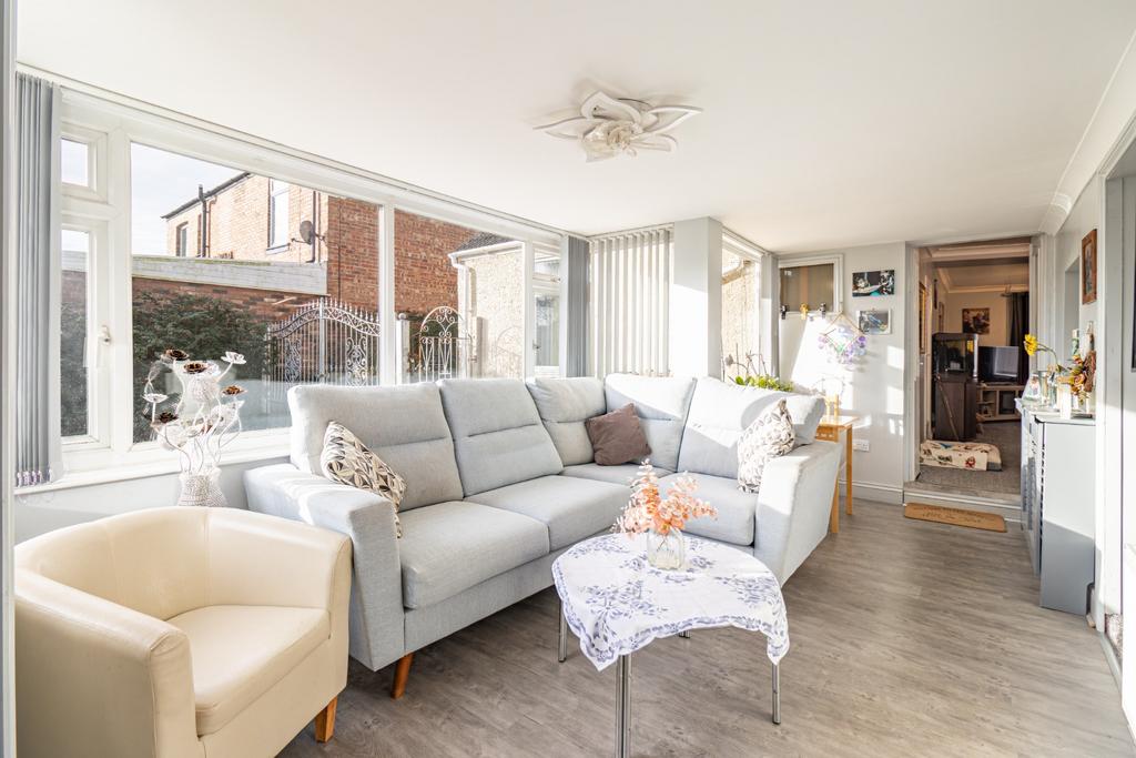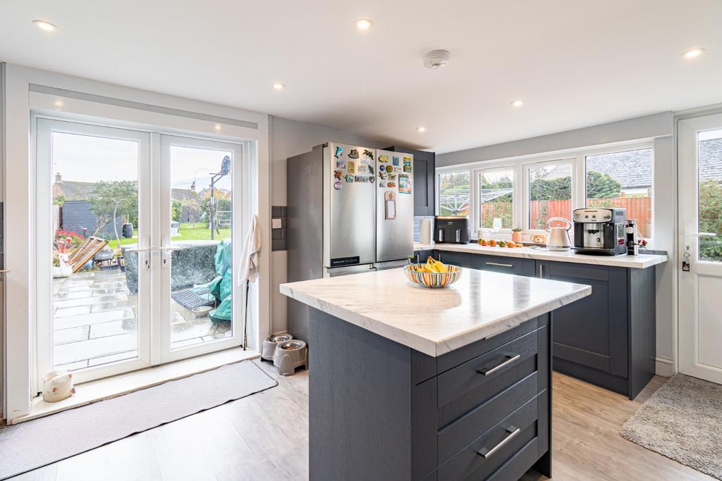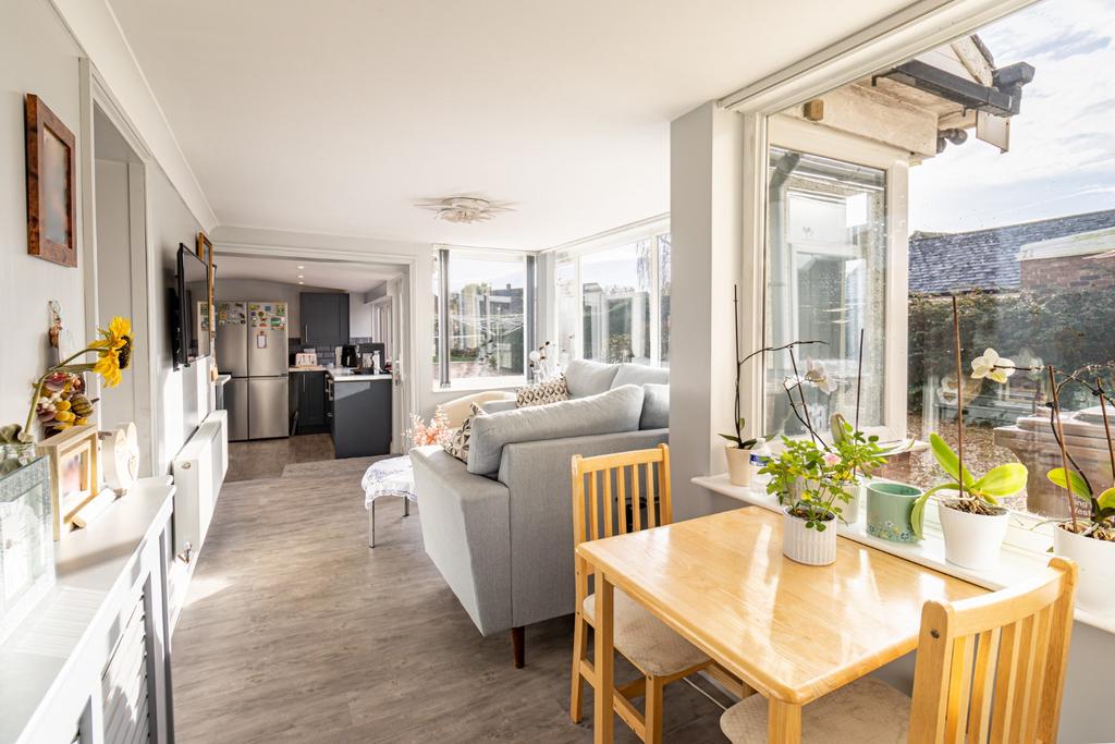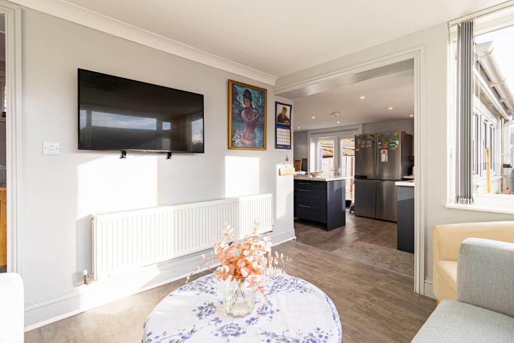 Upon entering the property, you are welcomed into an entrance hall that extends through the centre of the home. To one side of the hallway are two well-proportioned double bedrooms, both served by a modern shower room comprising a walk-in shower and a combination vanity unit with wash basin and WC. On the opposite side of the hall is the spacious living room, stretching over 24ft and offering an excellent space for entertaining. Moving towards the rear of the home, you will find a dedicated dining area and a sunlit garden room that provides a wonderful place to relax. Completing the accommodation, and one of the highlights of the home, is the contemporary kitchen overlooking the garden. It features a range of matching shaker-style storage units, a central island, gas hob with extractor, and integrated oven and microwave. The kitchen is further enhanced by a useful pantry cupboard and an additional storage cupboard currently used to discreetly house laundry appliances.