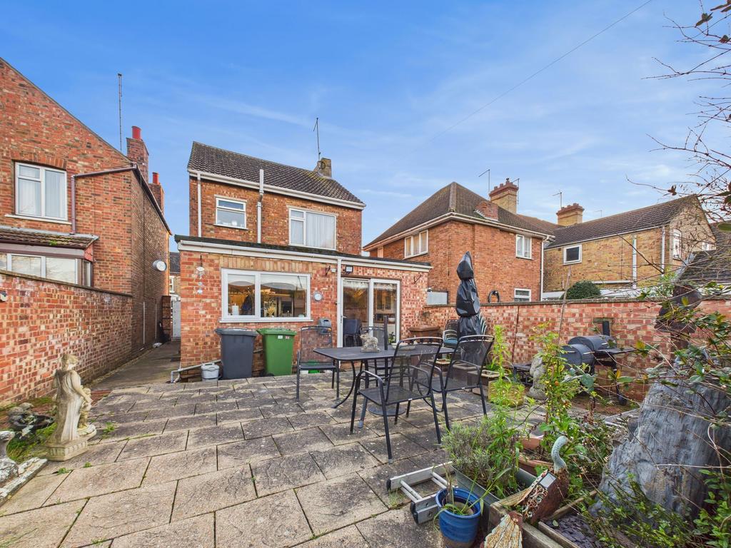 The property features a boundary wall enclosing the front garden, which is paved with concrete. It offers side access through a gate leading to the rear garden, where a spacious patio area is situated. A wall divides the well-maintained lawned garden, which also includes a shed and an expansive workshop that presents the potential for conversion into a home office.