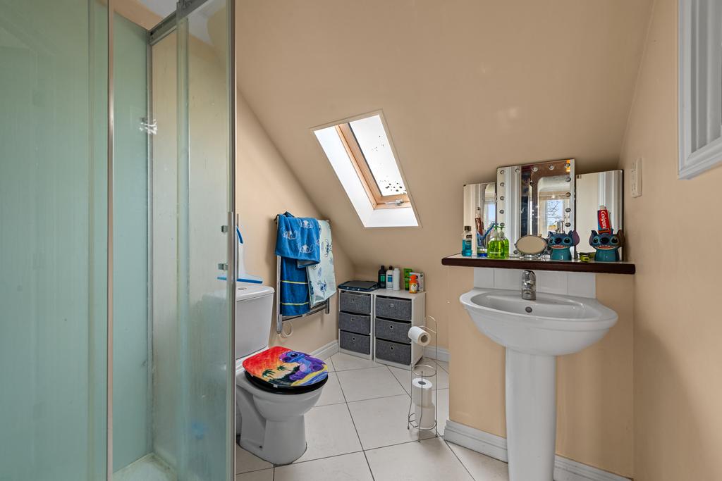 Having rooflight to rear elevation, part coved ceiling, heated towel rail, extractor, shaver point, built-in cupboard and tiled floor. Fitted with a suite comprising: shower enclosure with mixer shower fitting, close coupled WC and pedestal hand basin.