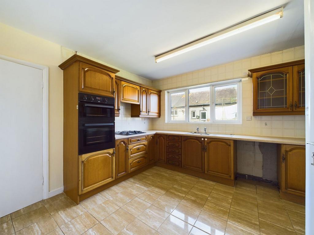 Traditional fitted kitchen with ample cupboard space. There is a 4 ring gas hob, oven and grill with extractor canopy and splash back tiling to compliment. The kitchen has ample space for table and chairs, with created space for washing machine & fridge. To the rear of the kitchen is a glazed door leading to the rear store room and side access to driveway/garden.