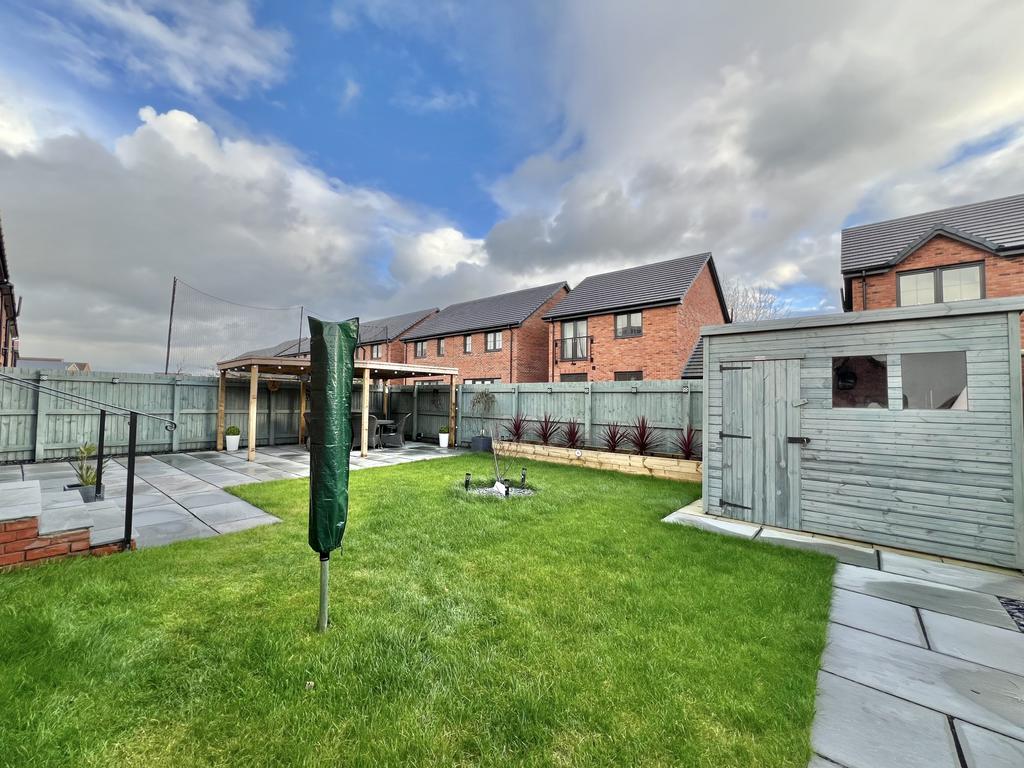 South facing garden with fabulous entertainment area, half laid with Indian stone and half laid to lawn with large bespoke wooden gazebo, lighting and power for great alfresco dinning, outside water tap.and garden shed for extra storage.