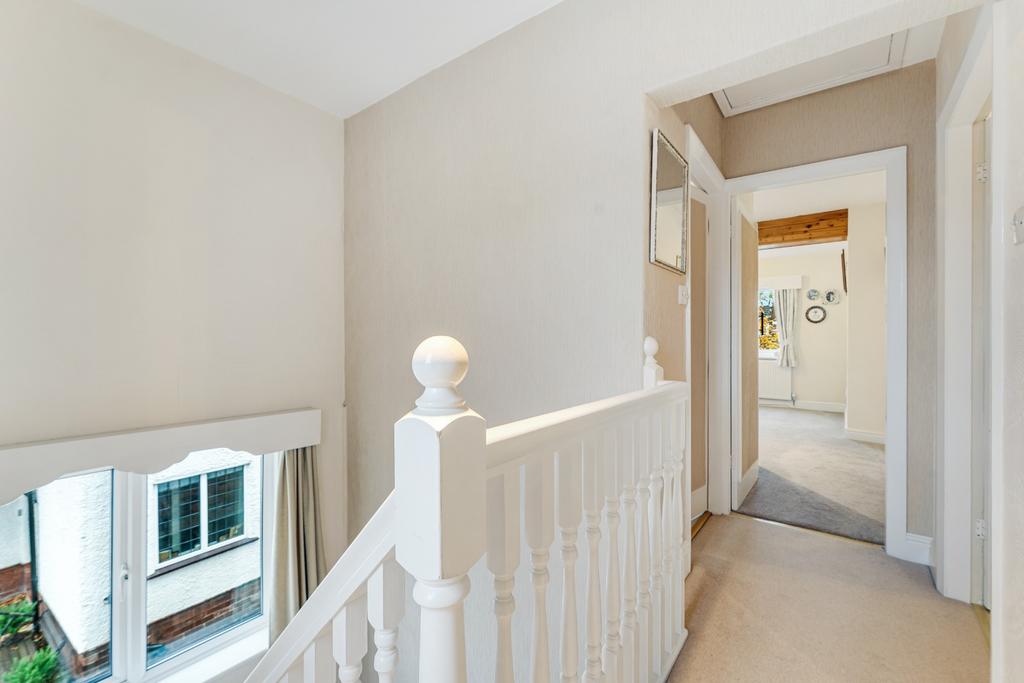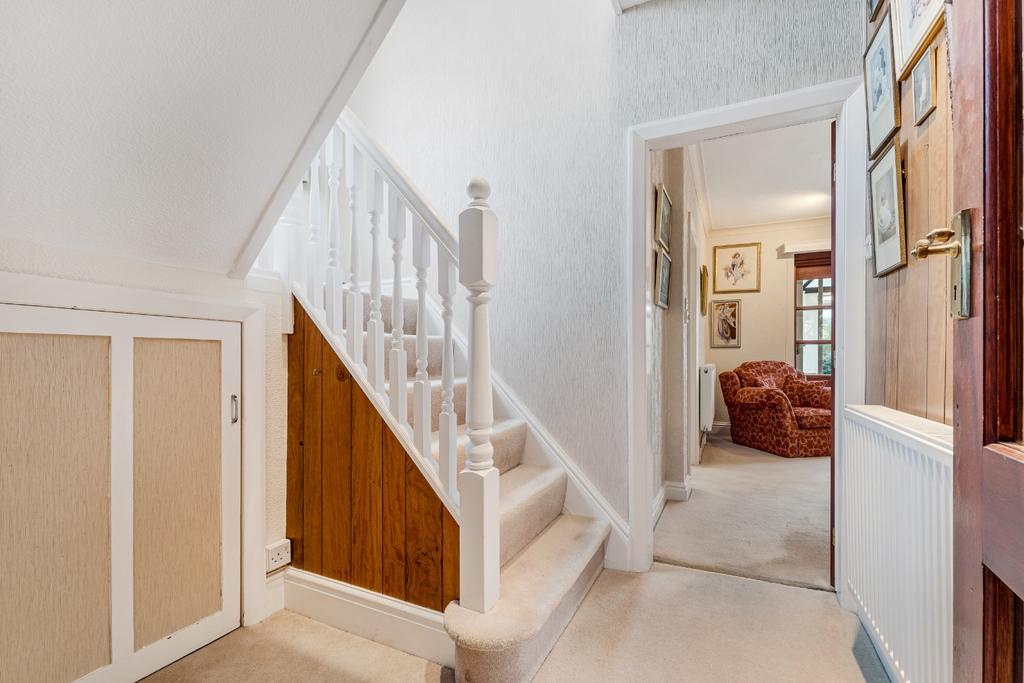 Understair storage. Single panel radiator. Pendant light. Panelled wall.
