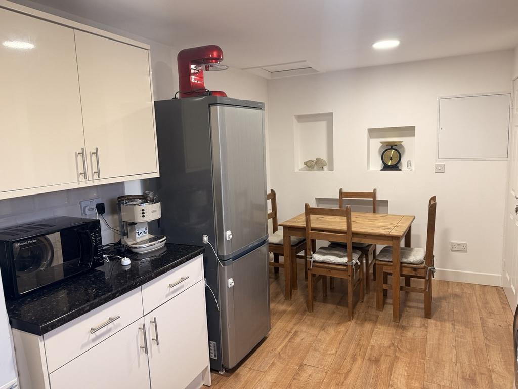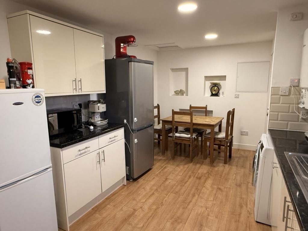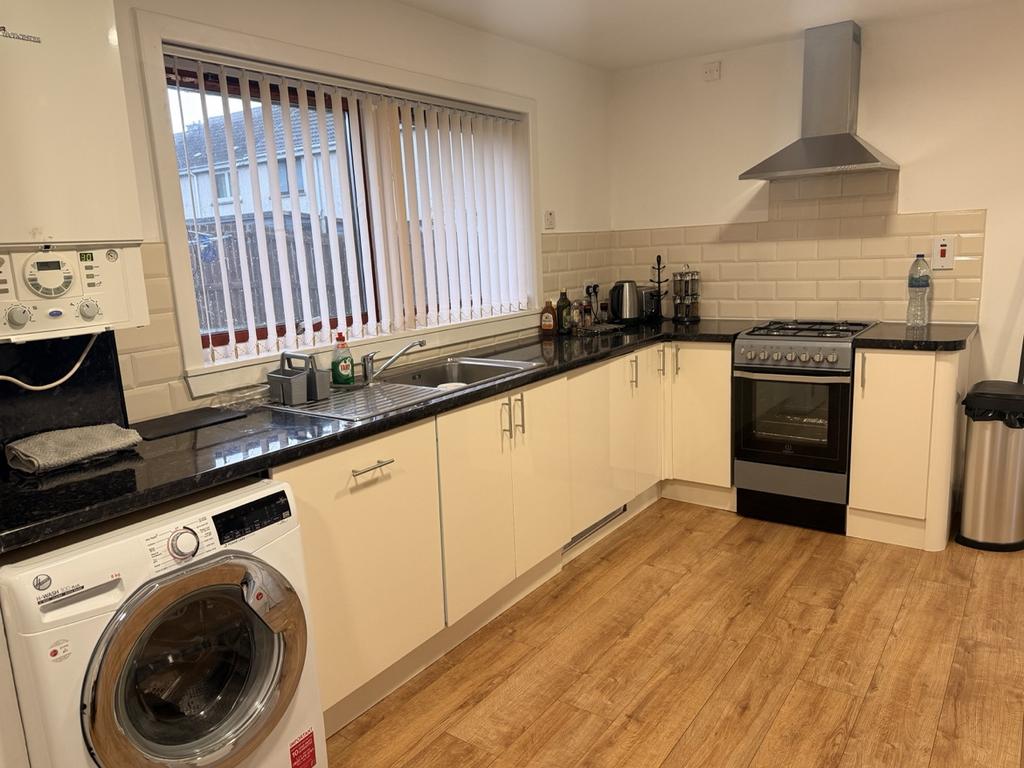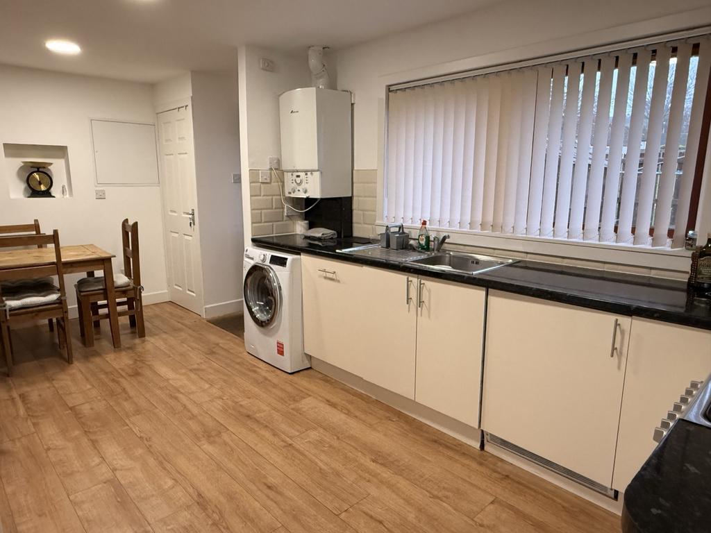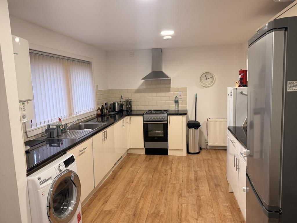 Modern fitted wall and base units. Tiled above the work tops. Window to the rear of the property. Storage cupboard. Laminate flooring. Radiator. Gas boiler. Loft access hatch. Extractor hood above cooker. Cupboard housing electric meter and fuse box.