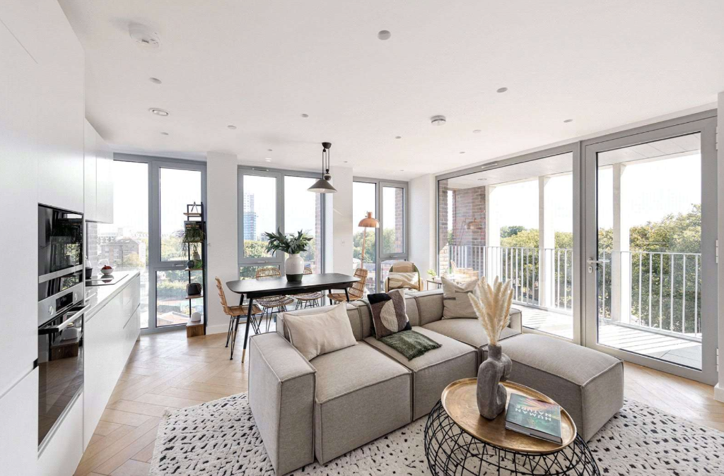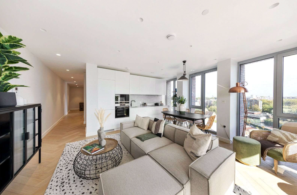 Ready to move into, this spacious fifth-floor three-bedroom, two-bathroom apartment combines elegant modern design with exceptional views across Hackney Downs and the City. The open-plan living, dining and kitchen area serves as a bright social hub, enhanced by floor-to-ceiling windows that flood the space with natural light and open onto a private balcony — perfect for relaxing or entertaining.