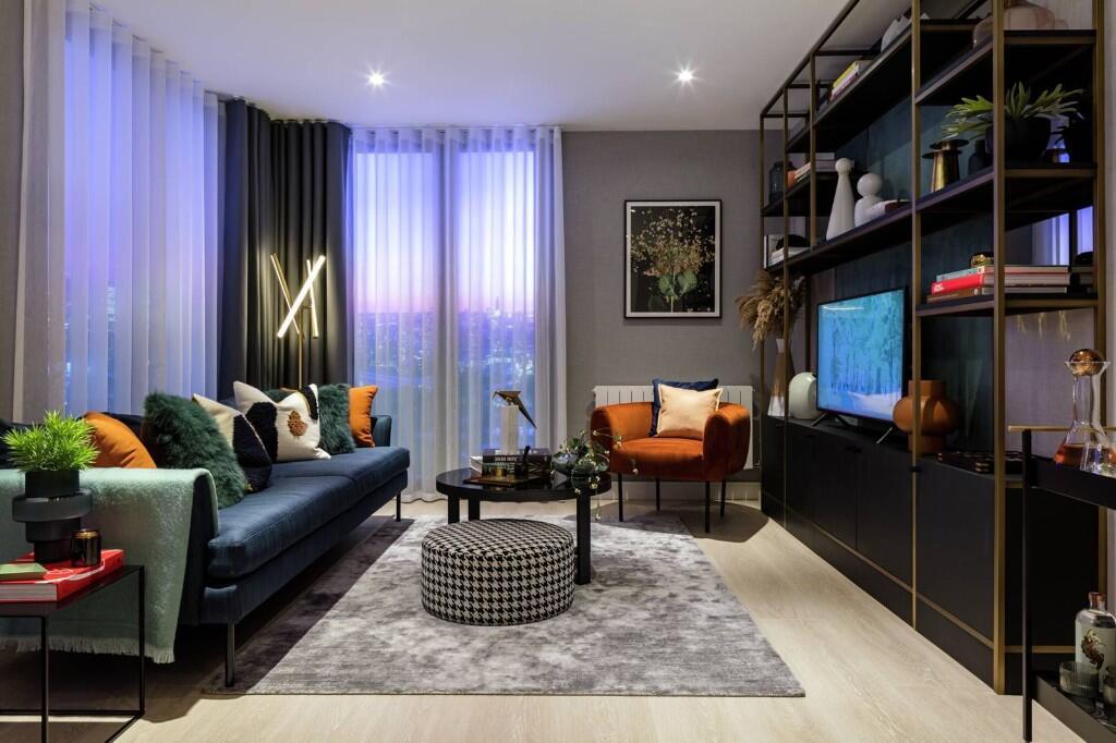 This contemporary three-bedroom, three-bathroom apartment spans 1,018 sq ft and delivers a perfect balance of space, light, and modern comfort in the heart of London E15. Designed for effortless city living, the apartment features open-plan interiors with large windows framing expansive skyline views, creating a bright and uplifting atmosphere throughout. The living and dining area flows seamlessly into a sleek fitted kitchen equipped with premium integrated appliances, ideal for both entertaining and everyday life.