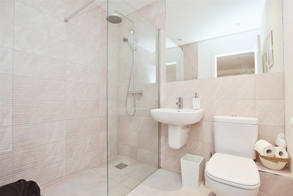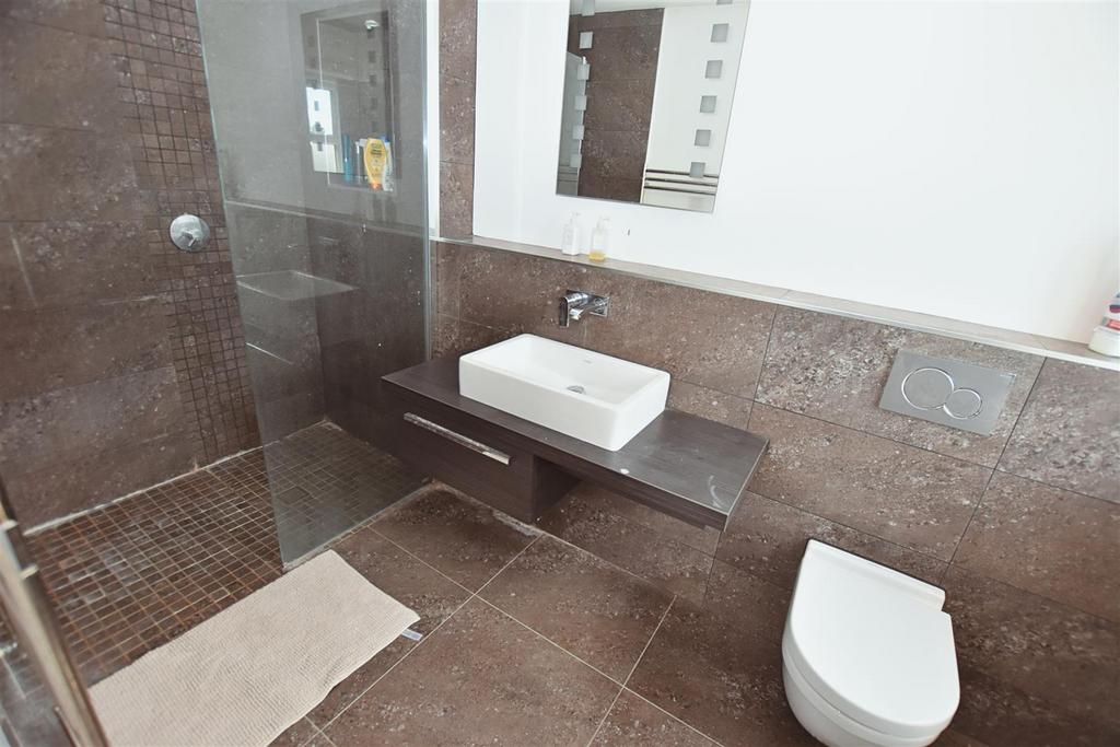 Shower Room - Smooth plaster ceiling, LED lighting, extractor fan, chrome heated ladder towel rail, white low level w.c. vanity wash hand basin, walk-in shower with tiled walls, glazed screen and raindrop shower, tiled splashbacks, wall mirror, tiled visible floor, underfloor heating.