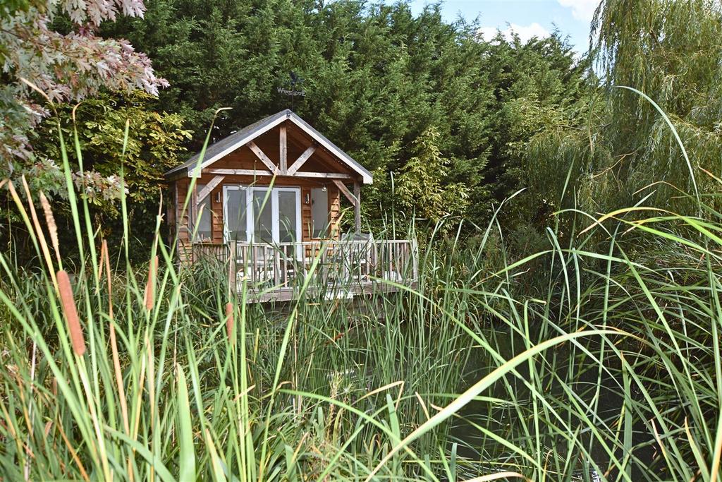 Formal Gardens - Laid to lawn with trees and shrubs, garden snug, naturally occurring pond with SUMMERHOUSE with deck and balustrade over looking the pond, PVCu sealed unit double glazed bi-fold doors, windows to front and side, light and power.