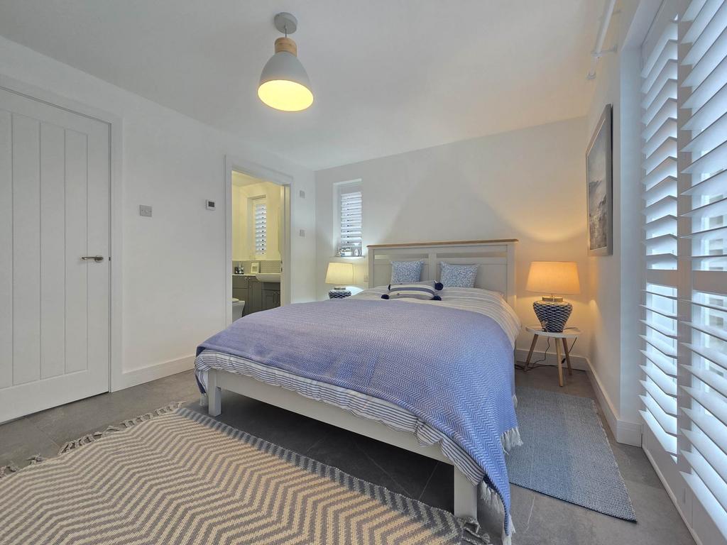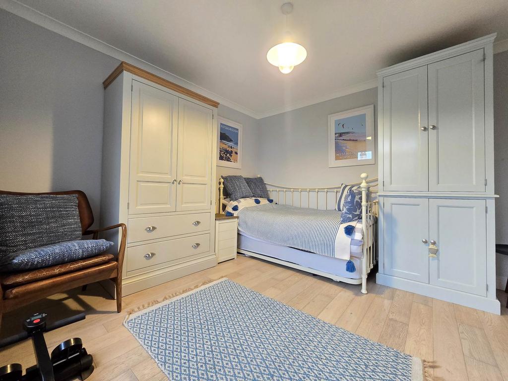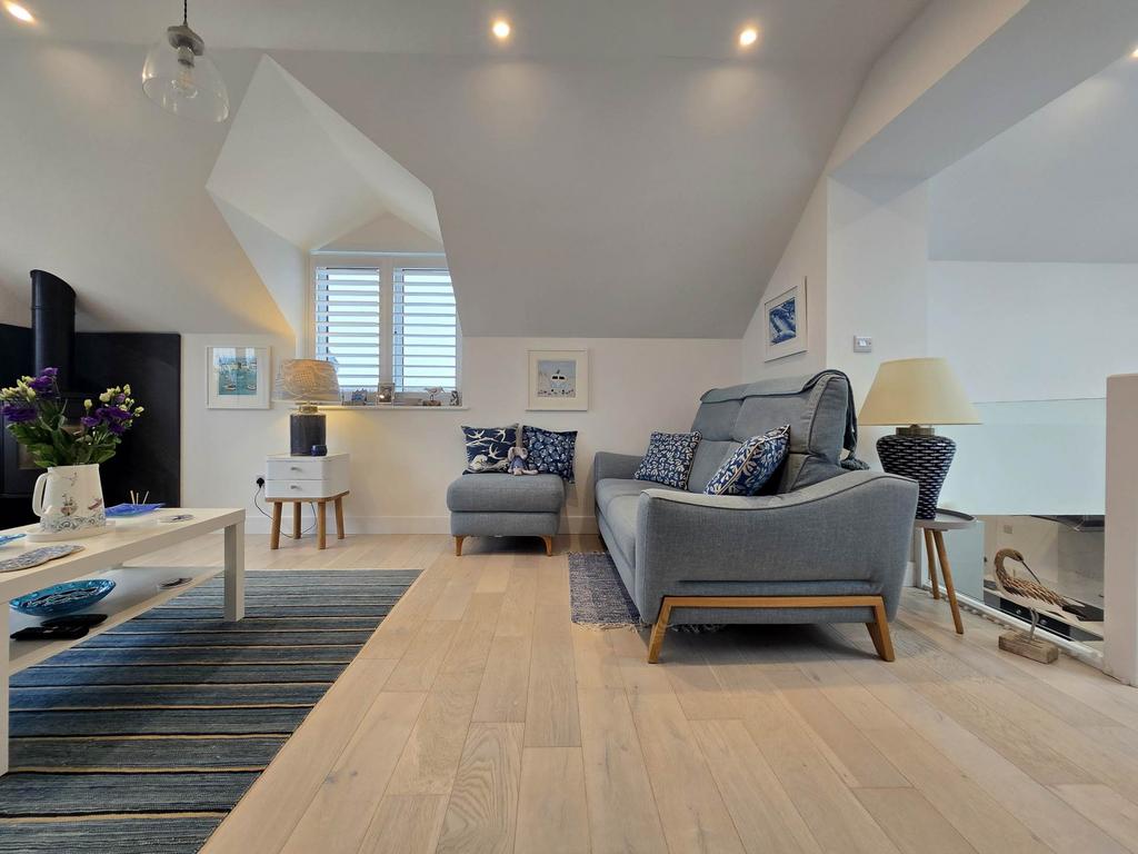 Ascending to the first floor, a superb living room takes full advantage of the property's elevated position and coastal outlook. French doors open to a Juliet balcony, inviting in fresh sea air, while a second wood-burning stove adds charm and comfort - perfect for unwinding and enjoying the views.