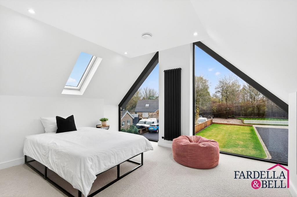 Natural light streams through expansive Velux‑style windows, instantly brightening this generous double bedroom. The calm atmosphere is complemented by sloping ceilings that lend architectural character and a sense of openness. Finished in a crisp, modern palette, the space offers flexibility for furnishings and storage solutions. Completing the picture of comfort, a private en‑suite shower room is seamlessly connected for everyday convenience.