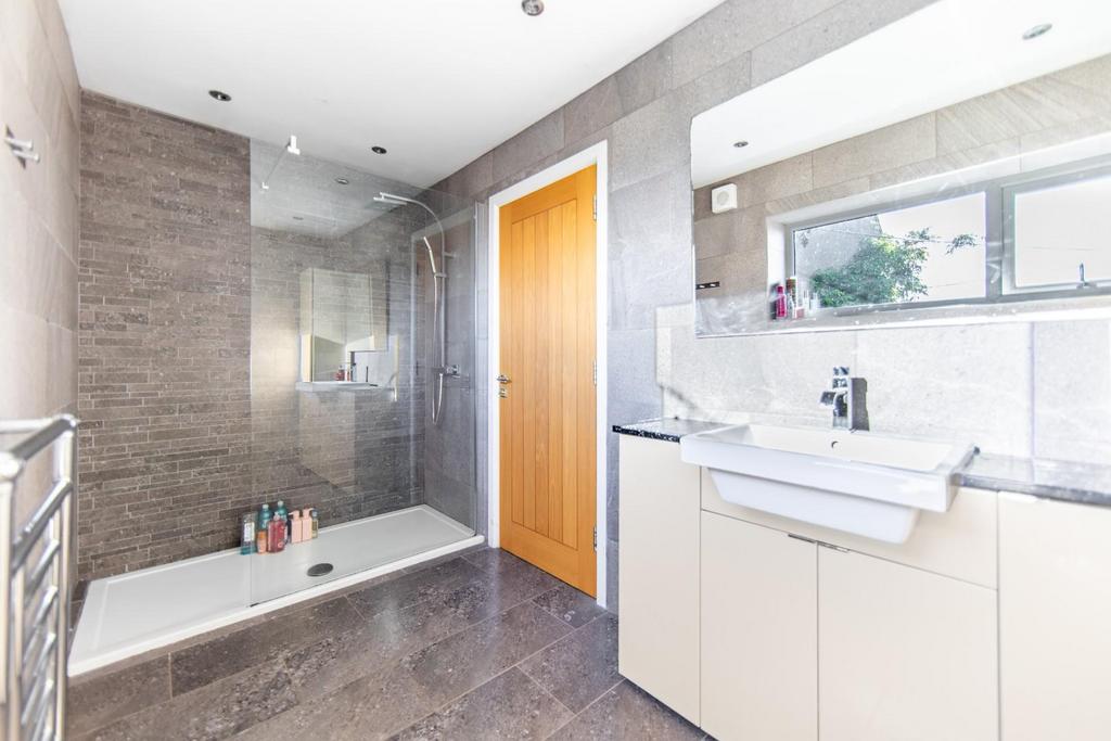 The kitchen is well equipped with integral appliances and a superb range of wall and base units providing excellent storage and work surface space. It also features a central island and another fireplace housing a further wood-burning stove. To the right of the kitchen is a large dining room that leads into a porch/boot room with a door opening to the side of the property. To the left of the kitchen is a useful utility room, which in turn leads to a stylish ground-floor shower room comprising a WC, washbasin and fully tiled walk-in shower.