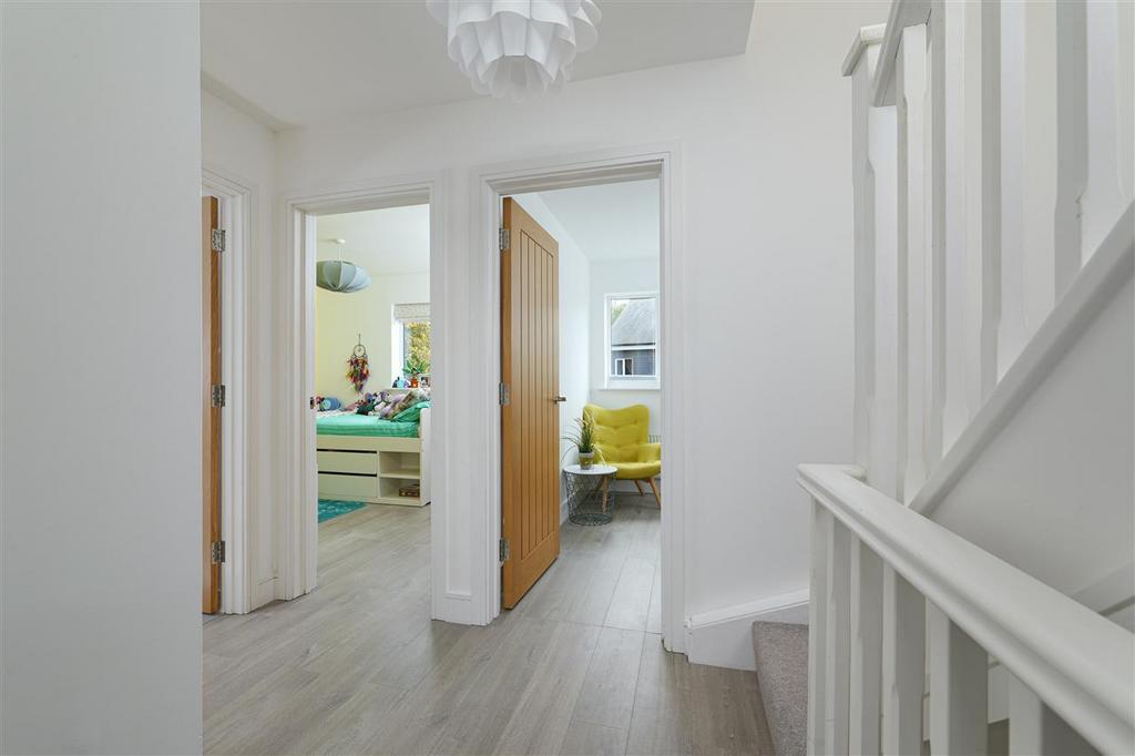 To the first floor, high-quality laminate flooring flows seamlessly throughout, a galleried landing with a full-height window floods the space with natural light and provides room for a desk or reading area. This level also features a well-appointed family bathroom and three generously proportioned bedrooms. The second floor is dedicated to the principal bedroom, complete with an en suite shower room, offering a private and comfortable retreat.