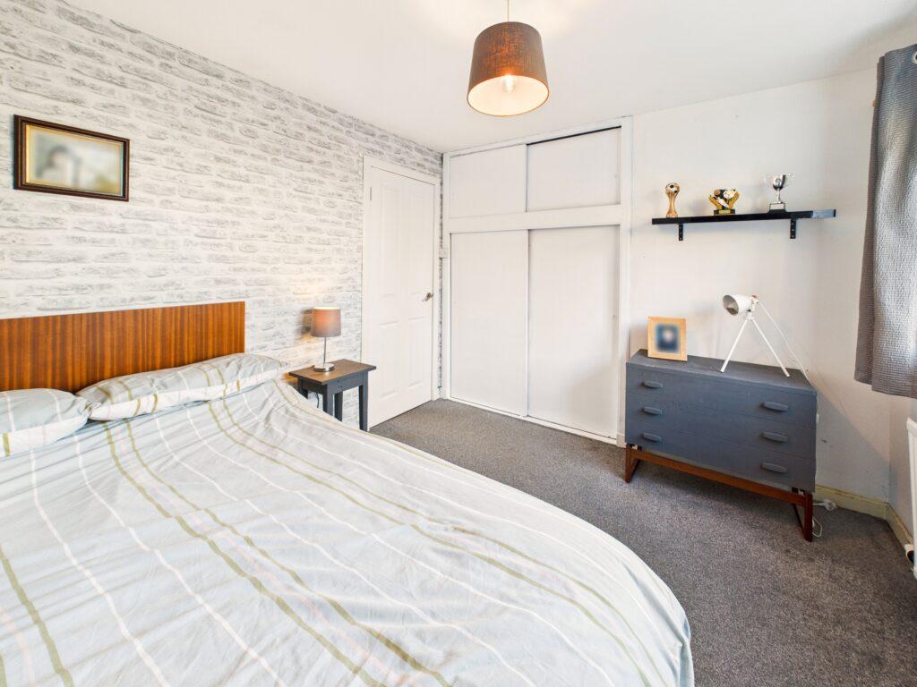 A well-proportioned double bedroom with carpeted flooring, inbuilt wardrobes, pendant lighting, a central heating radiator, wallpapered feature wall and window views to the side of the property.