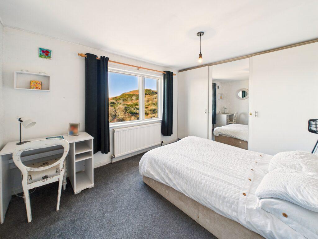 Delightful double bedroom with elevated view to the front. Quadruple inbuilt wardrobes, space for freestanding furniture, carpeted flooring, central heating radiator and pendant lighting.