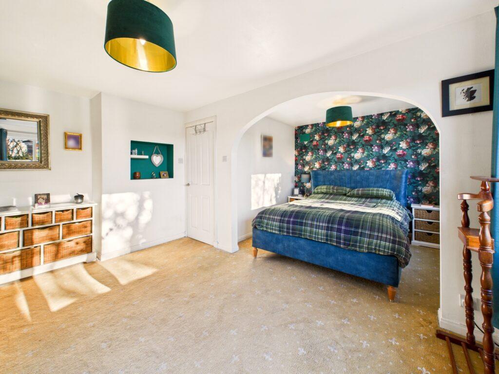 A generous double bedroom with delightful archway defining the sleeping area. Carpeted flooring, wallpapered feature wall, pendant lighting, central heating radiator and window views over the gardens. Plenty of room for freestanding furniture.