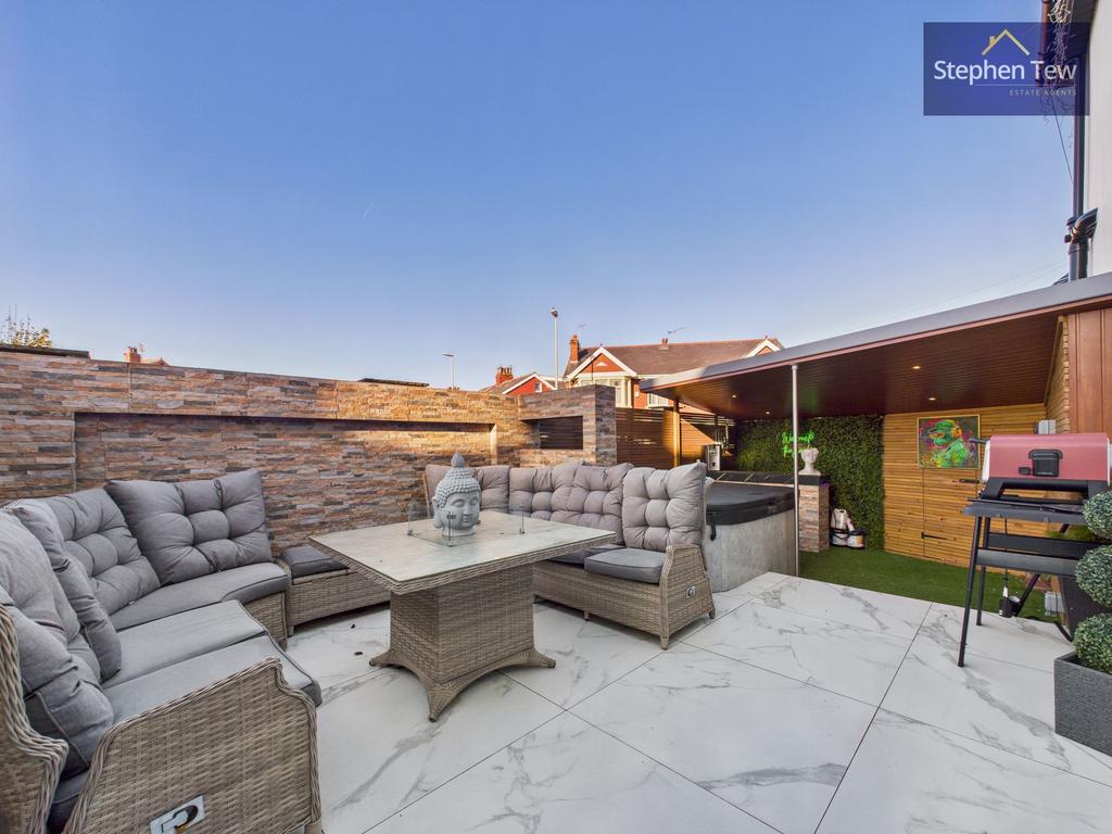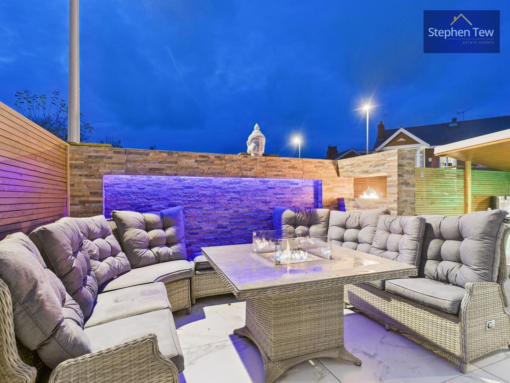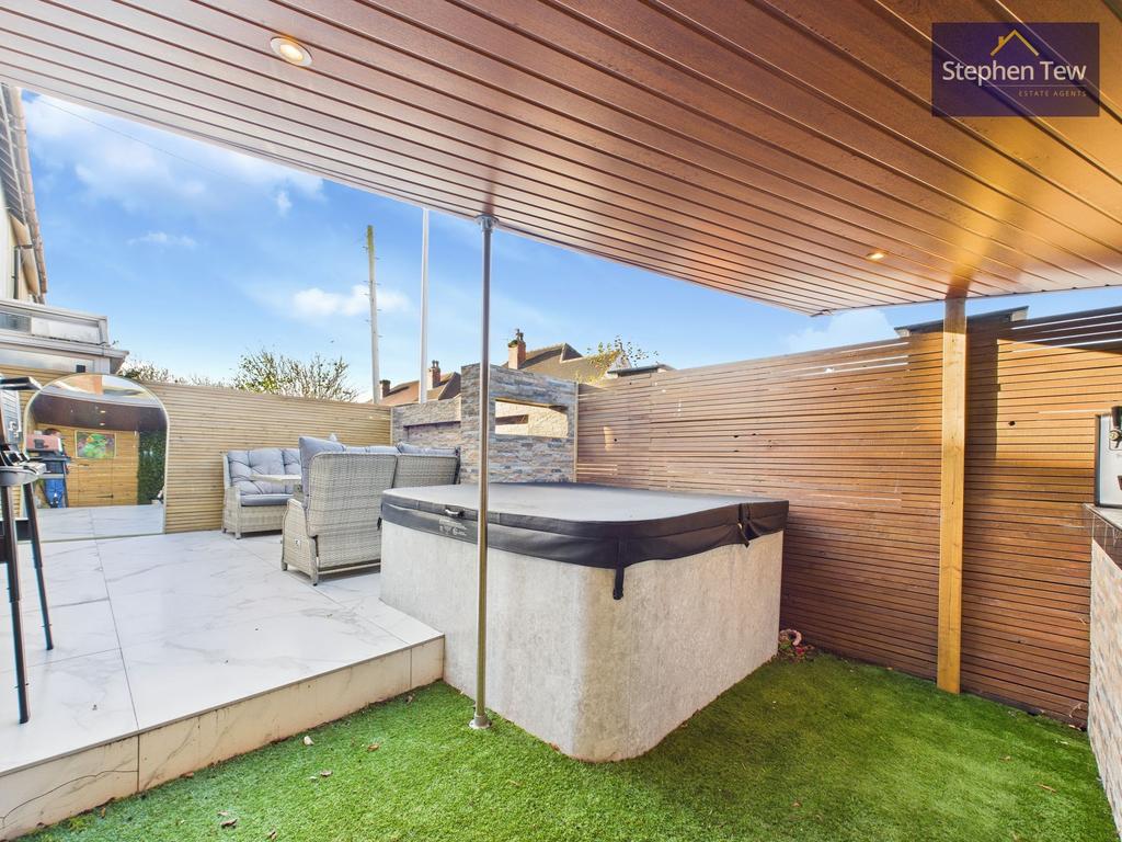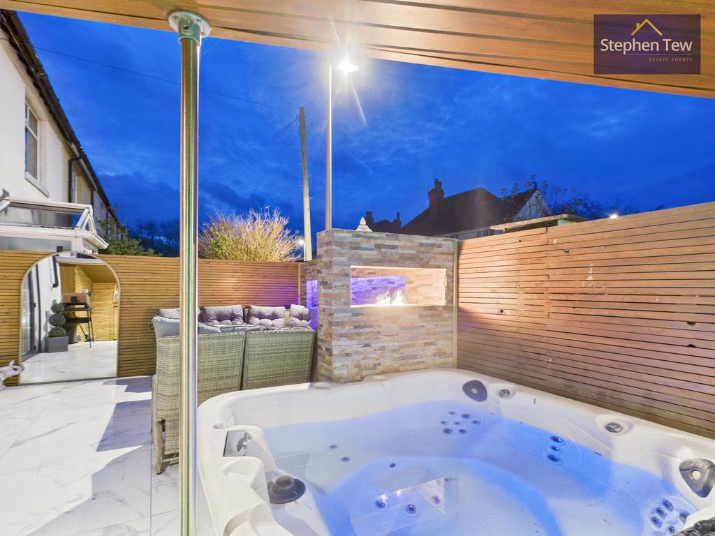 Luxurious tiled flooring throughout, creating a sense of elegance and sophistication. Enveloped by a spacious private garden with artificial grass, outdoor living is a delight with a covered patio housing a hot tub and an outdoor entertaining area with waterfall and fire.