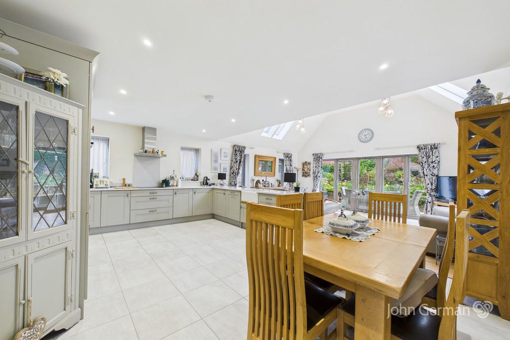 At the heart of the home is a truly stunning open-plan living, kitchen and dining space, where three distinct areas flow together seamlessly. This breathtaking room features a part-vaulted ceiling, dual-aspect windows, multiple skylights, and multiple sets of French doors opening onto the garden, ensuring an abundance of natural light throughout the day. The kitchen provides generous space for family dining and entertaining, beautifully appointed with a luxury Charnwood kitchen comprising a comprehensive range of cabinetry and contrasting granite worktops with inset Belfast sink. Integrated Bosch appliances include an induction hob with extractor, eye-level oven and grill, fridge-freezer, and dishwasher. A practical tiled floor extends through to the adjoining utility/boot room, fitted with additional matching cabinetry, appliance spaces for washing machine and tumble dryer, and a door leading outside. The sitting area continues the home's elegant design with oak flooring, a vaulted ceiling, and French doors opening onto the landscaped rear garden, framed by twin picture windows that flood the room with light.