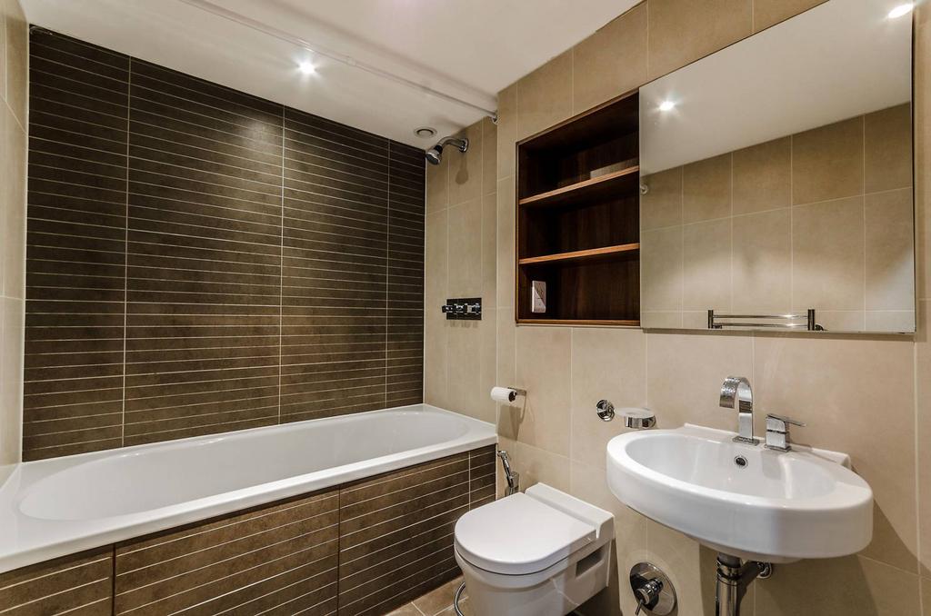- Contemporary fully-tiled bathroom