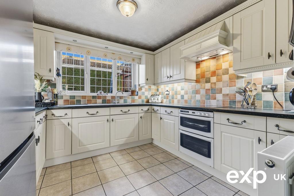 The ground floor provides an excellent layout with a bright living area leading to a generous conservatory — a brilliant second reception space that has served as a family room, playroom and entertaining space, complete with underfloor heating. The modern fitted kitchen offers good storage and preparation space, with built-in appliances (dishwasher, oven and hob included), and a downstairs WC adds to the convenience.