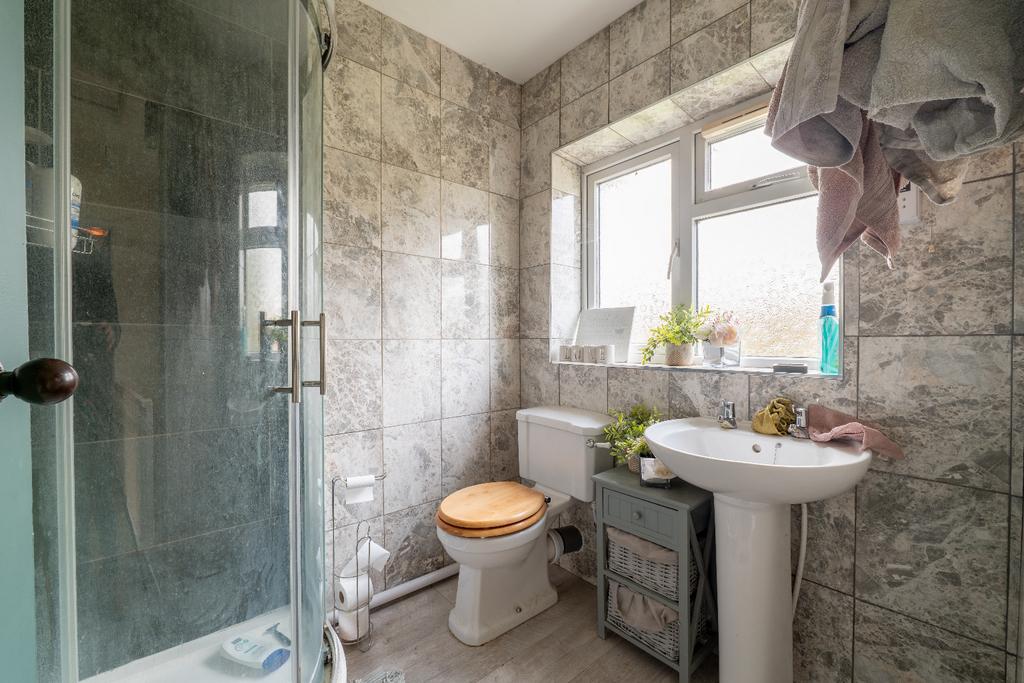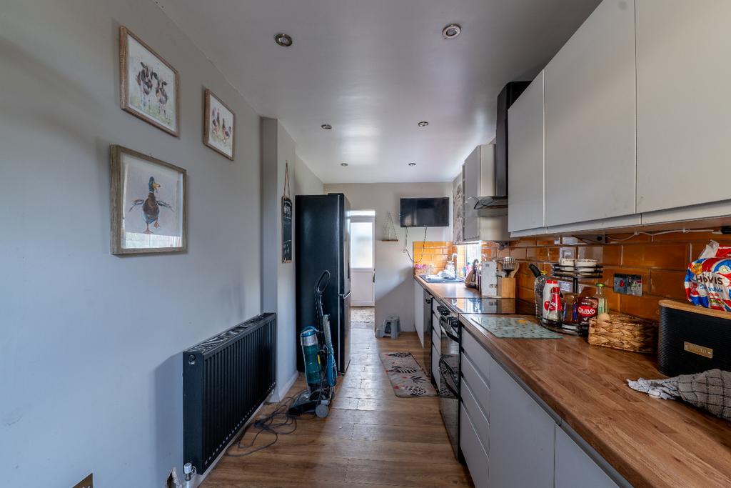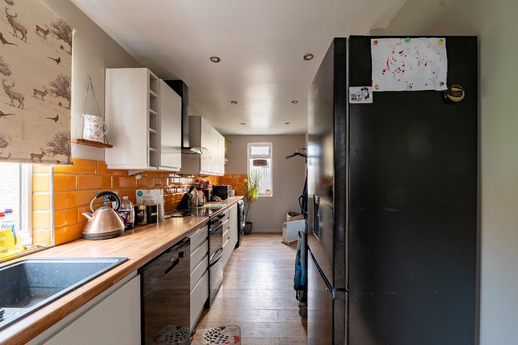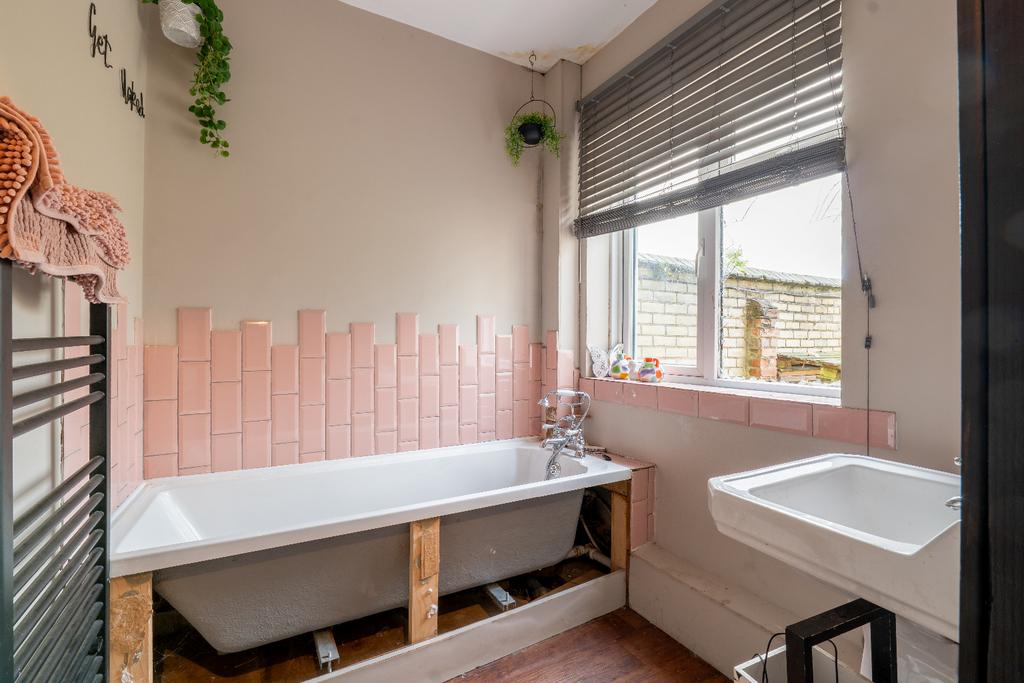 The front door opens into a welcoming hallway with access to both reception rooms, stairs rising to the first floor and a convenient downstairs bathroom that has recently started renovation. The living and dining rooms have recently been opened up to create a large, versatile open-plan reception space — an ideal blank canvas for a new owner to finish to their own taste. Once complete, the area will provide a bright and sociable setting for both relaxation and entertaining, with double doors leading out to the rear garden.The recently fitted kitchen has been thoughtfully arranged with a range of fitted units, work surfaces, and space for appliances, along with a convenient WC and utility area to the rear.