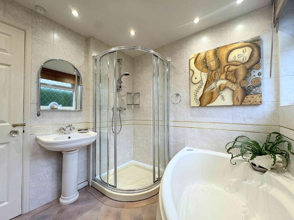 A four-piece bathroom suite comprising a spa bathtub, shower cubicle with glass screen and handheld power shower, pedestal sink, and low flush toilet. The walls are tiled, and the room is completed with a chrome towel radiator, ceiling spotlights, extractor fan, and UPVC windows.
