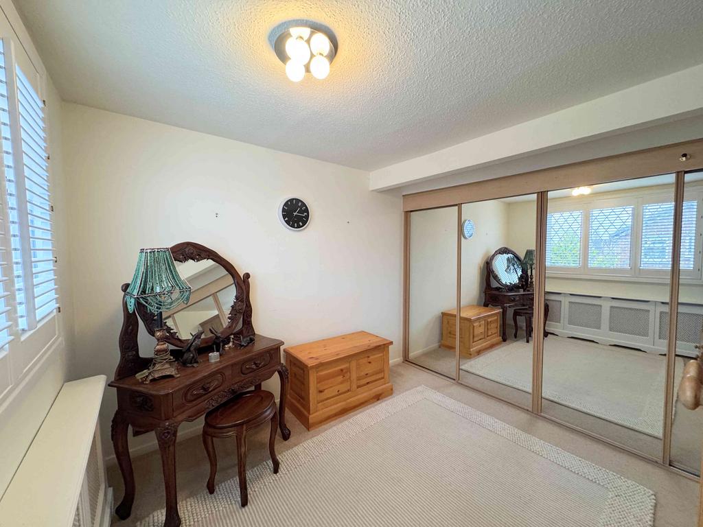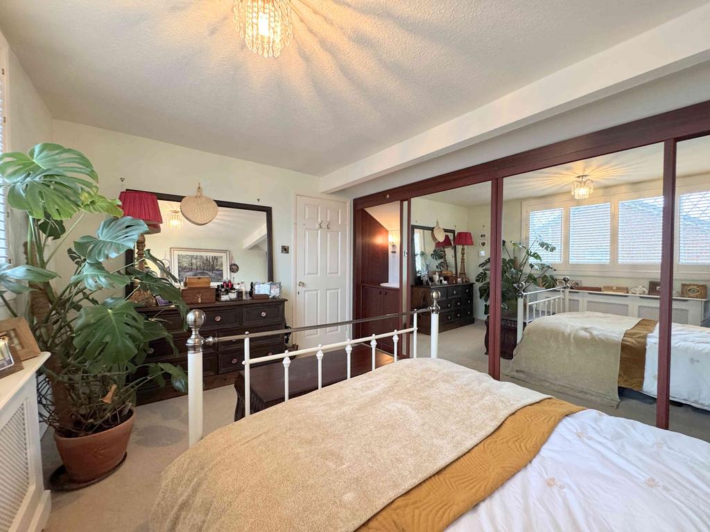 A further double bedroom with full-length mirrored fitted wardrobes, a vanity sink unit, radiator, ceiling beam, and UPVC windows with shutters. There is also access to loft space in the eaves.