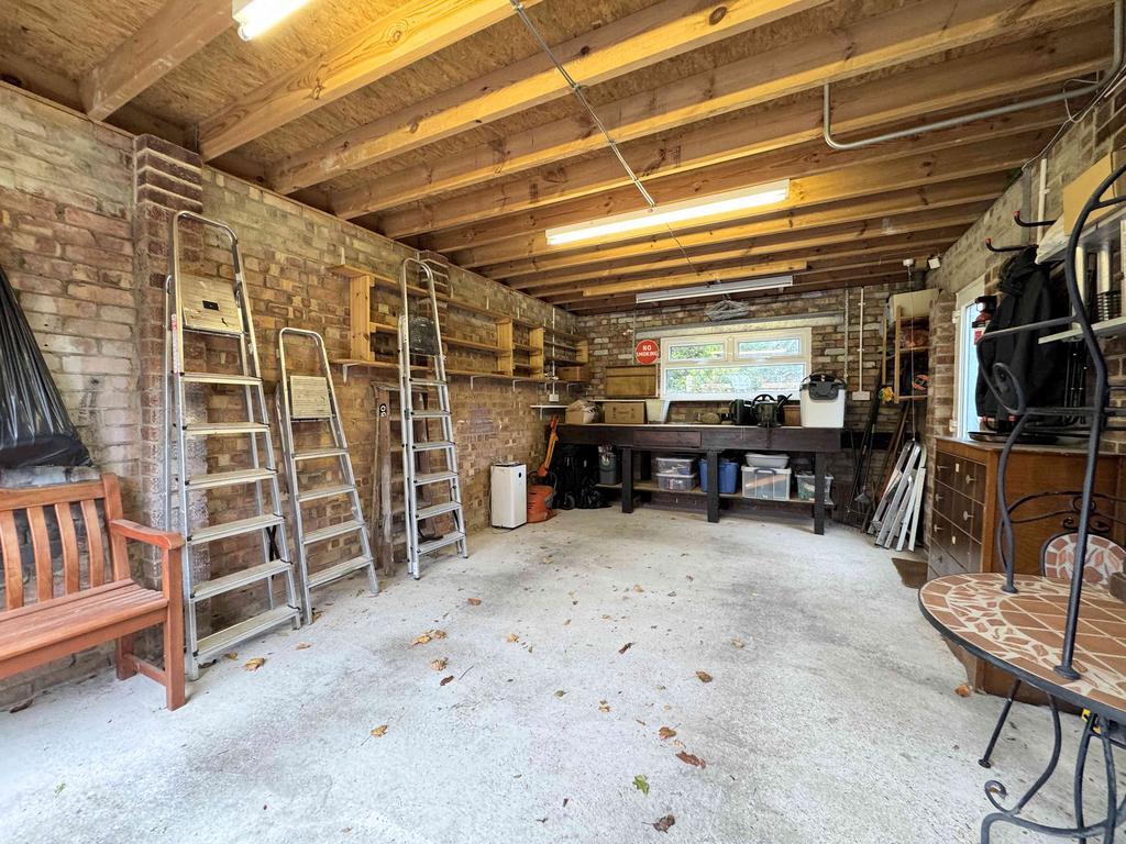 A spacious garage fitted with a remote-controlled roller door, large workbench and ample storage, UPVC window, and UPVC door leading into the rear garden. The roof was renewed in 2024.