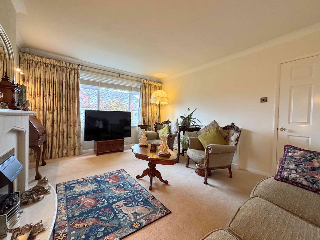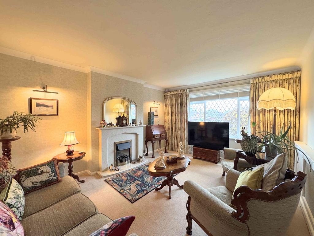 A spacious lounge featuring a fireplace with electric fire, coving, a radiator, and a large UPVC window.